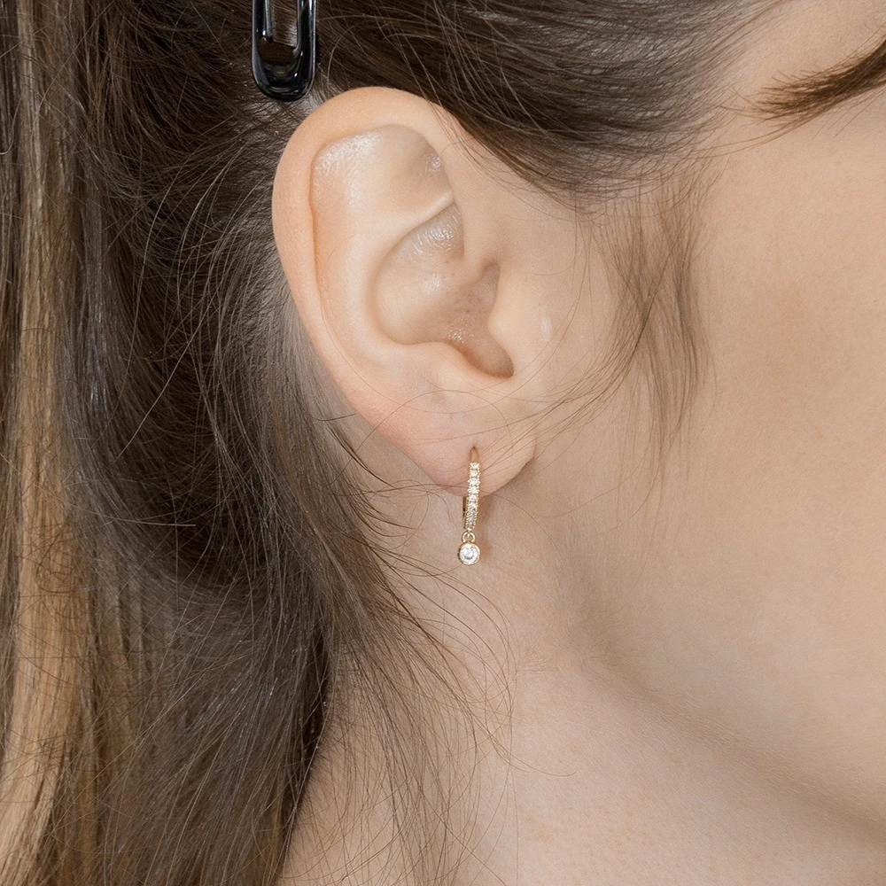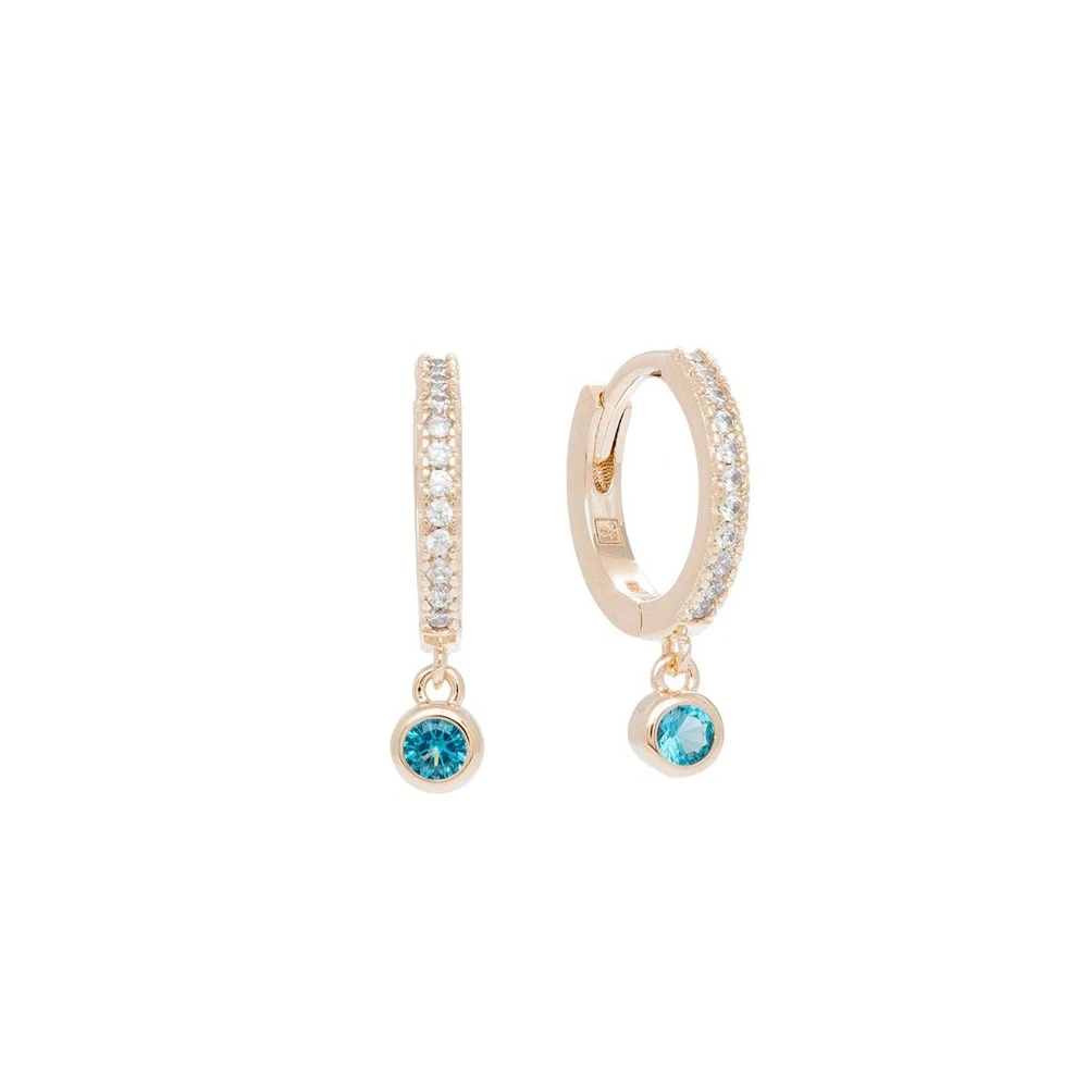 Ces mini créoles composées de petits strass et agrémentées d’un zircon bleu sont en plaqué or et signées By Jollia.