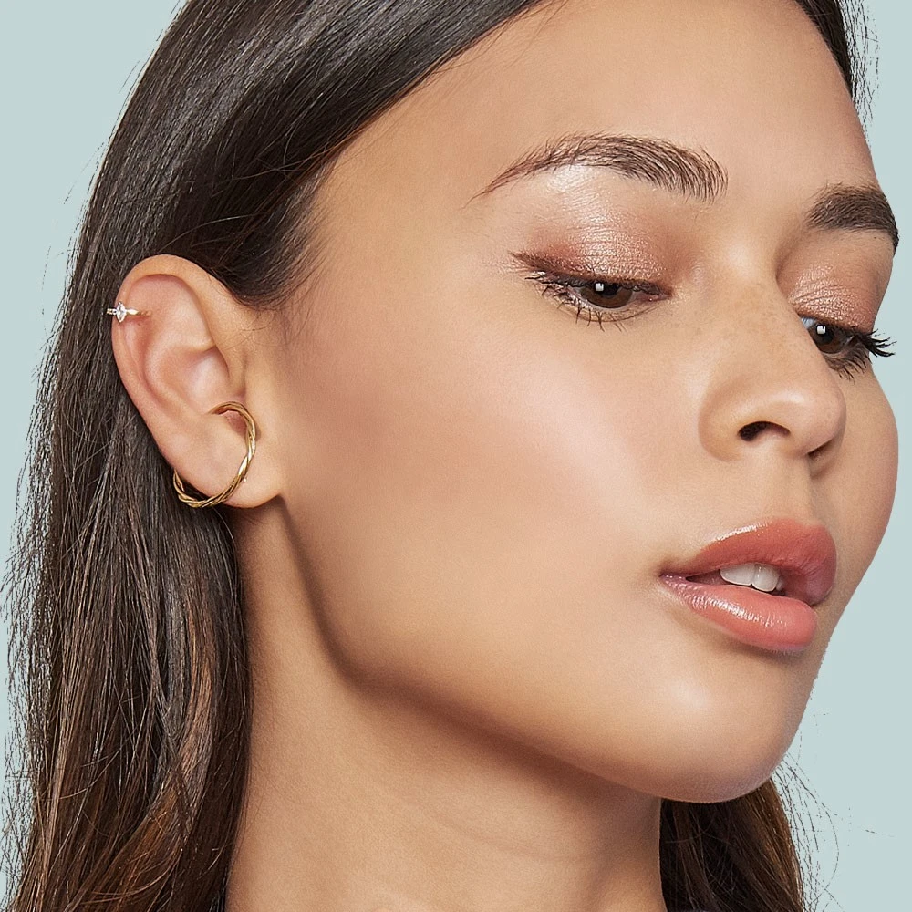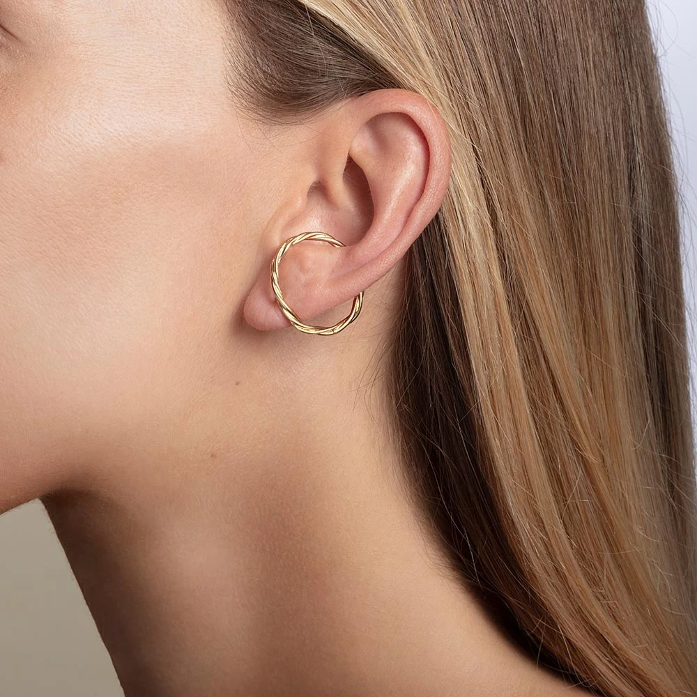 Mono boucle anneau torsadé de la créatrice April Please. Elle est en plaqué or 3 microns et tressée à la main à partir de matériaux bruts. Elle peut se porter accumulée à d’autres créations.