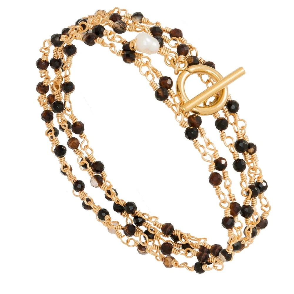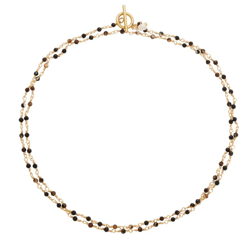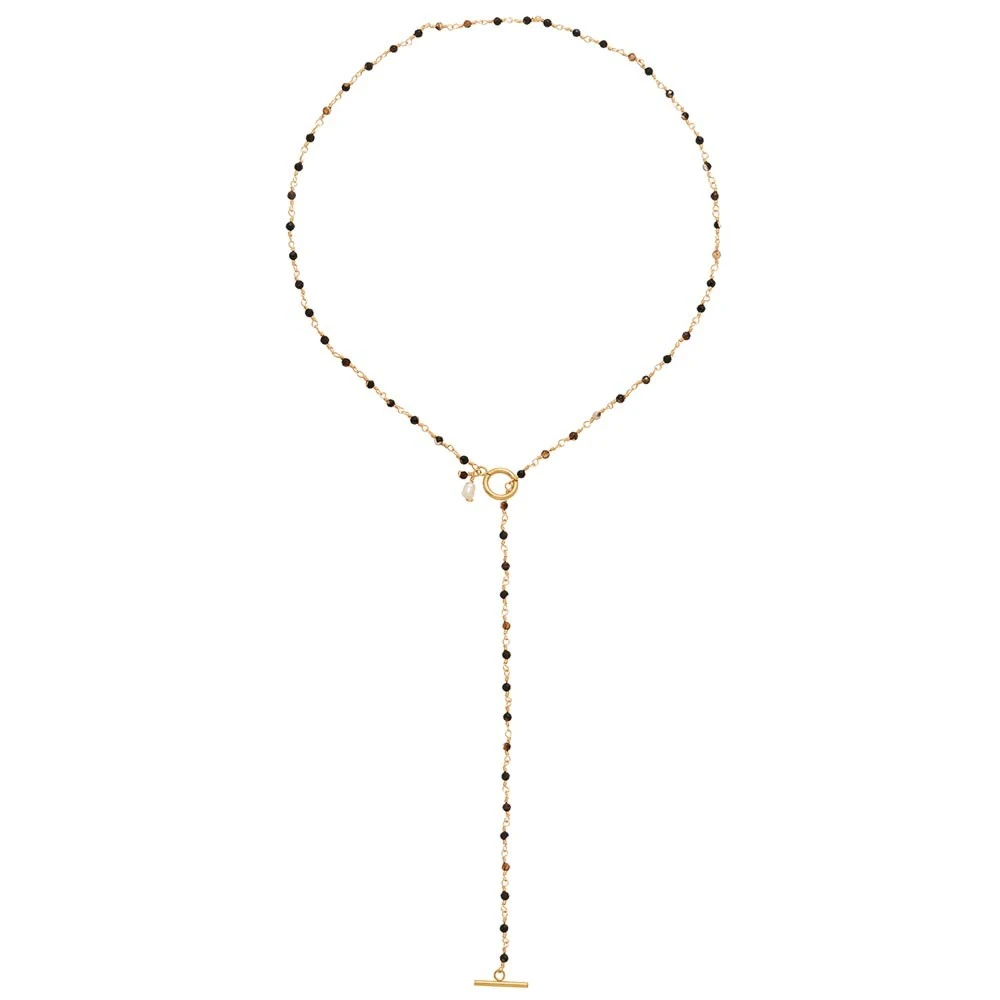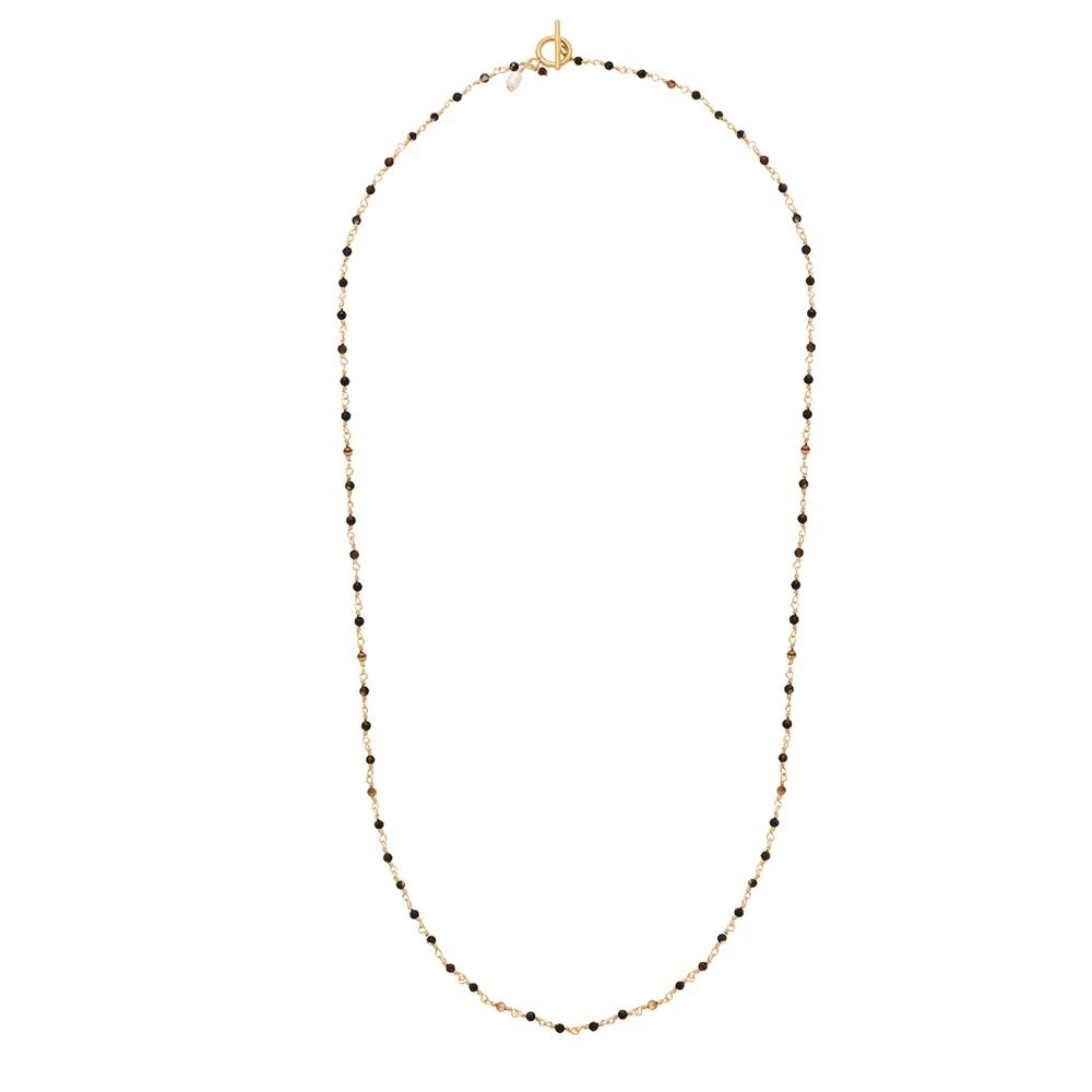 Multi-tours/sautoir doté de perles fines en agate noire aux reflets bruns. Il est en acier chirurgical trempé dans un bain doré.