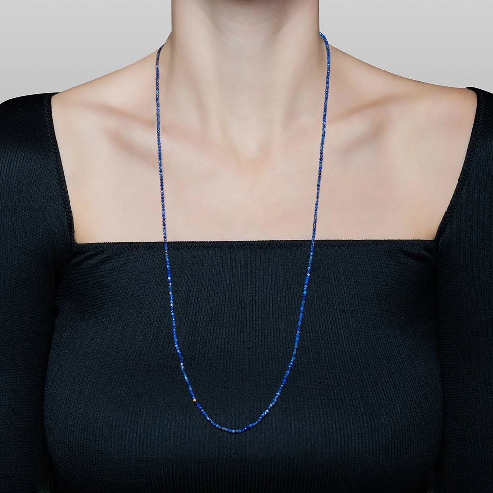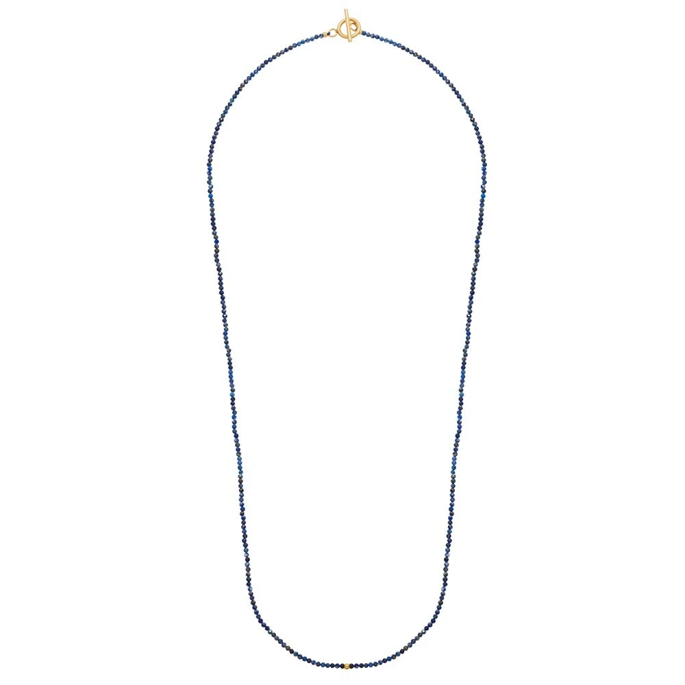 Multi-tours/sautoir doté de pierres facettées en lapis lazuli. Il est en acier chirurgical trempé dans un bain doré.