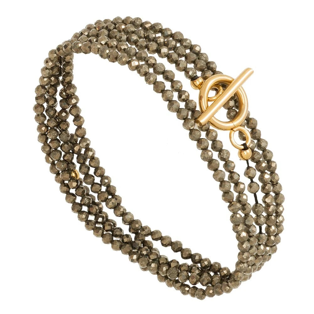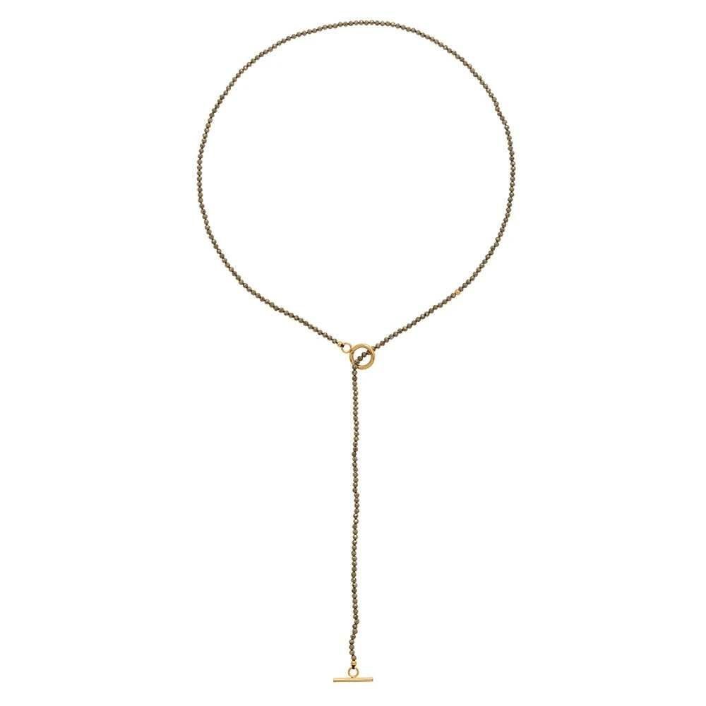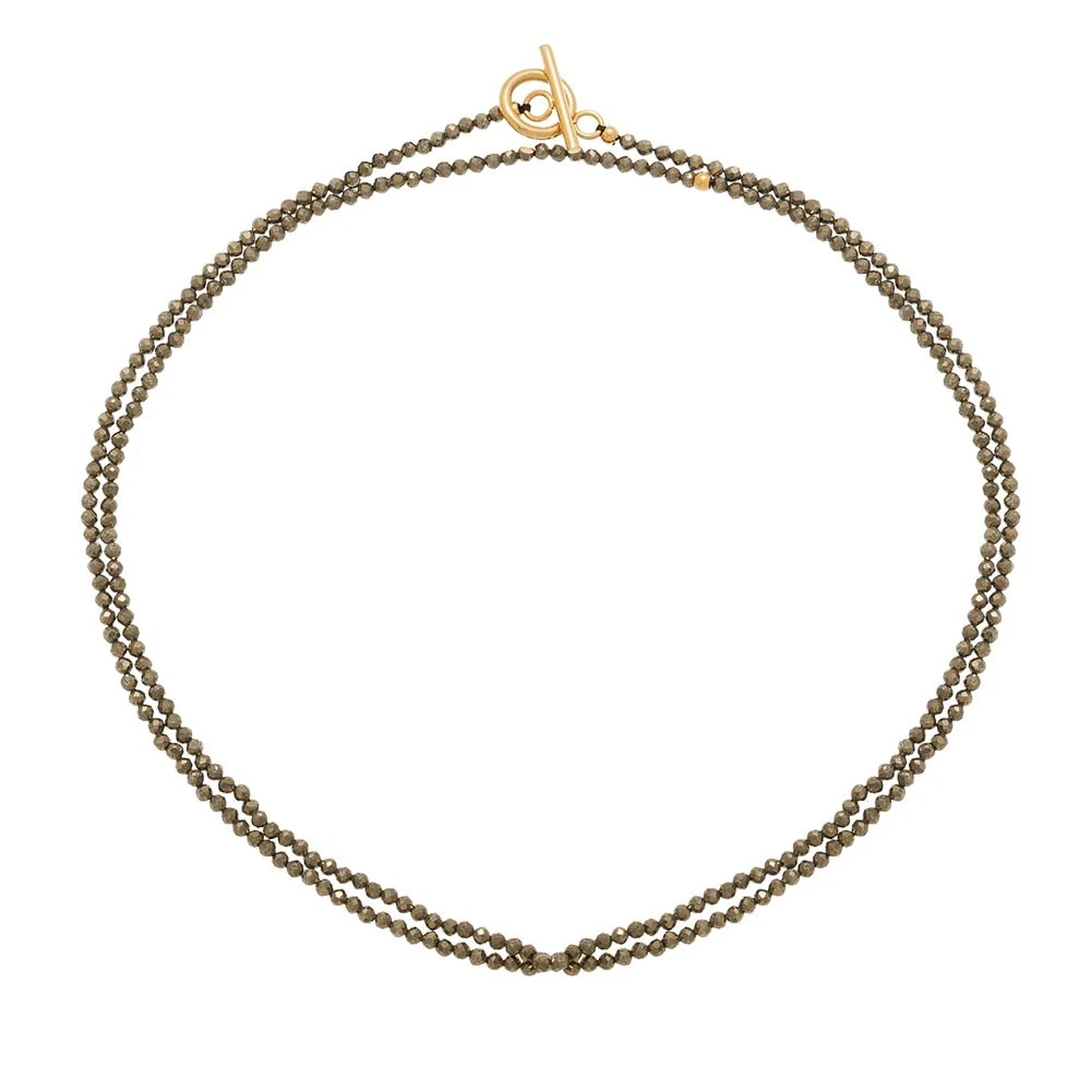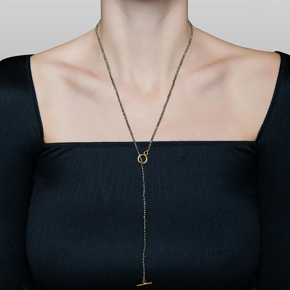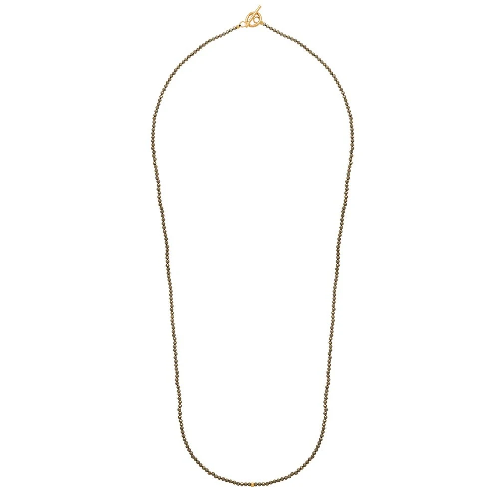 Multi-tours/sautoir doté de pierres facettées en pyrite. Il est en acier chirurgical trempé dans un bain doré.