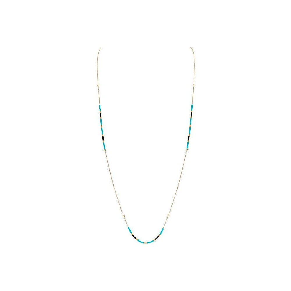Ce sautoir fine chaine en plaqué or est orné par endroit de perles japonaises noires et turquoises mobiles. Mininaliste et raffiné, il habille discrètement toutes vos tenues.