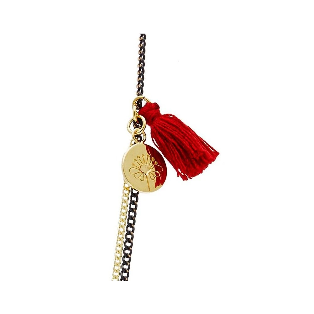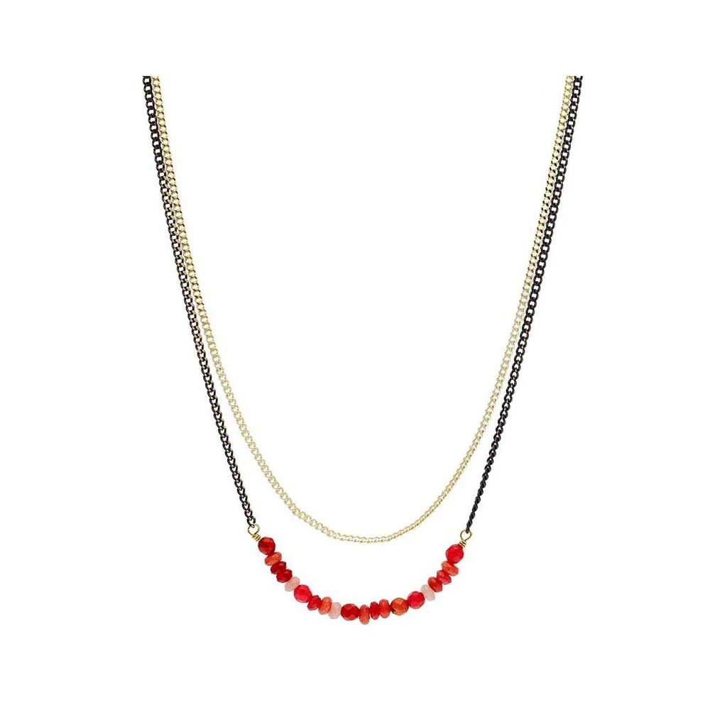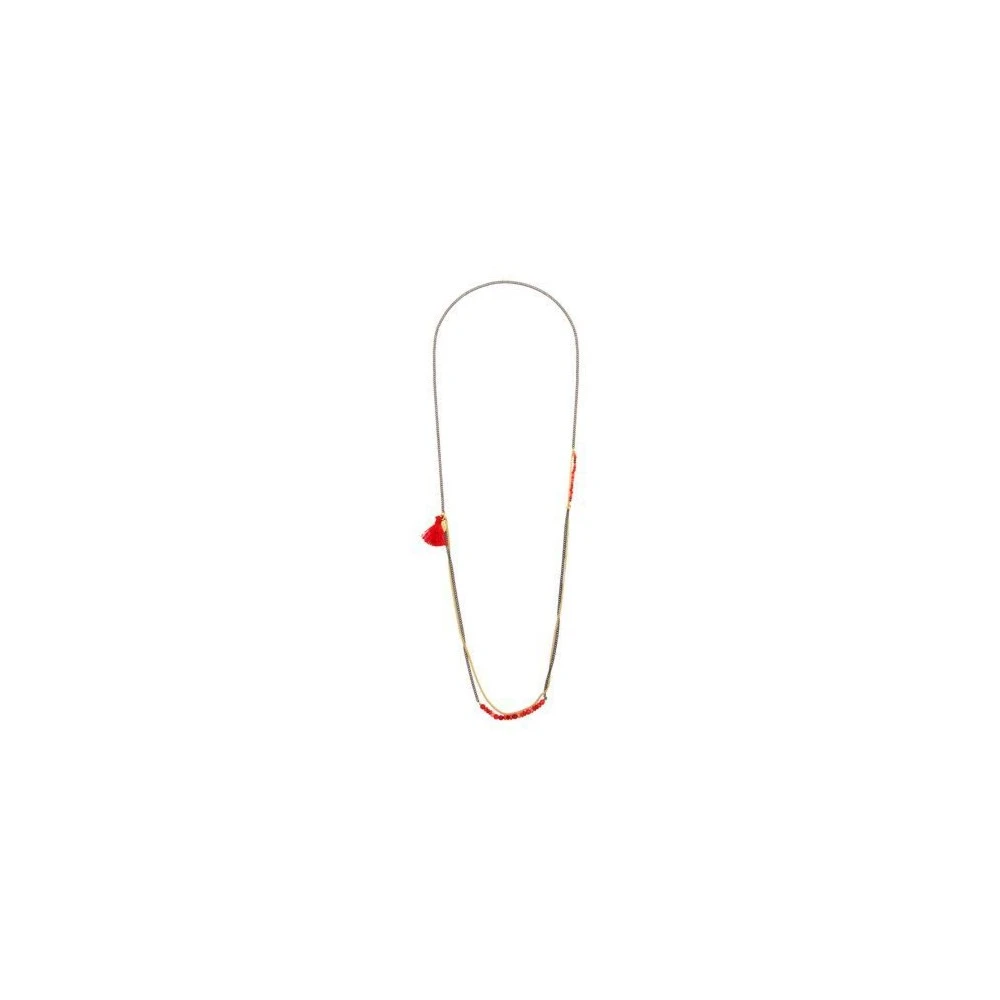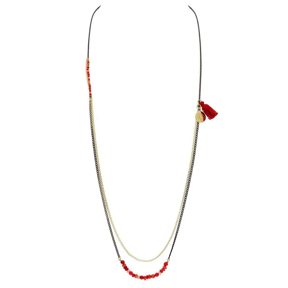 Ce sautoir, signé Louise Hendricks, est composé de 3 chaines dorée et noires, un rang de pierres facettées dans un camaIeu de rouge, une barrette de pierres lisses et un pompon.