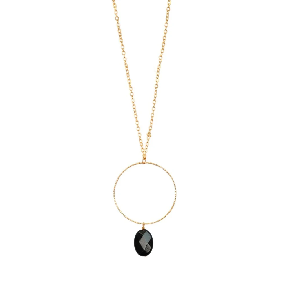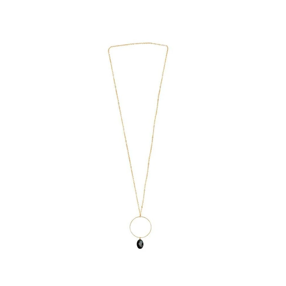 Ce sautoir en plaqué or 14 carats est signé Oscar Bijoux. Il est composé d’un pendentif cercle vrillé et d’une pierre naturelle noire.