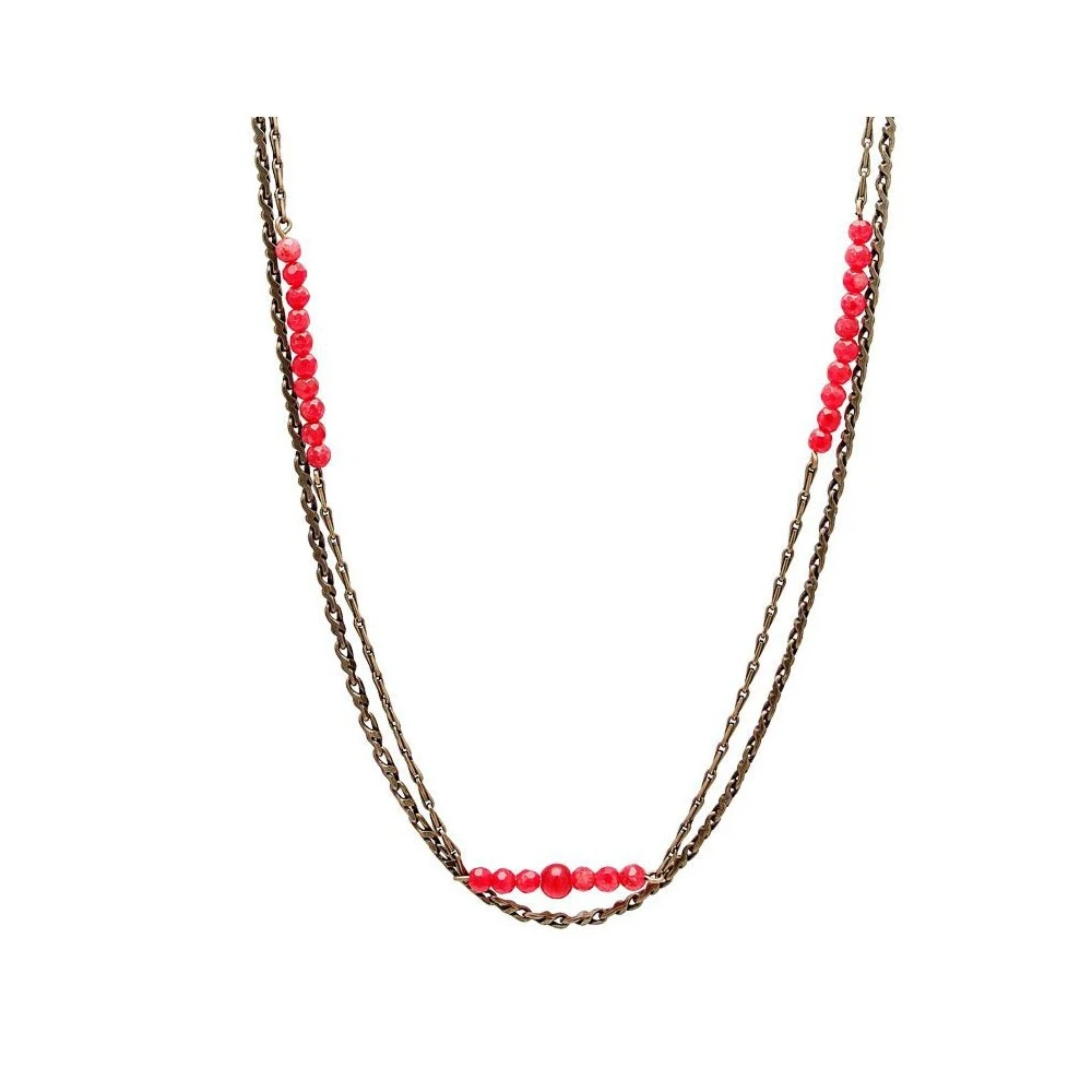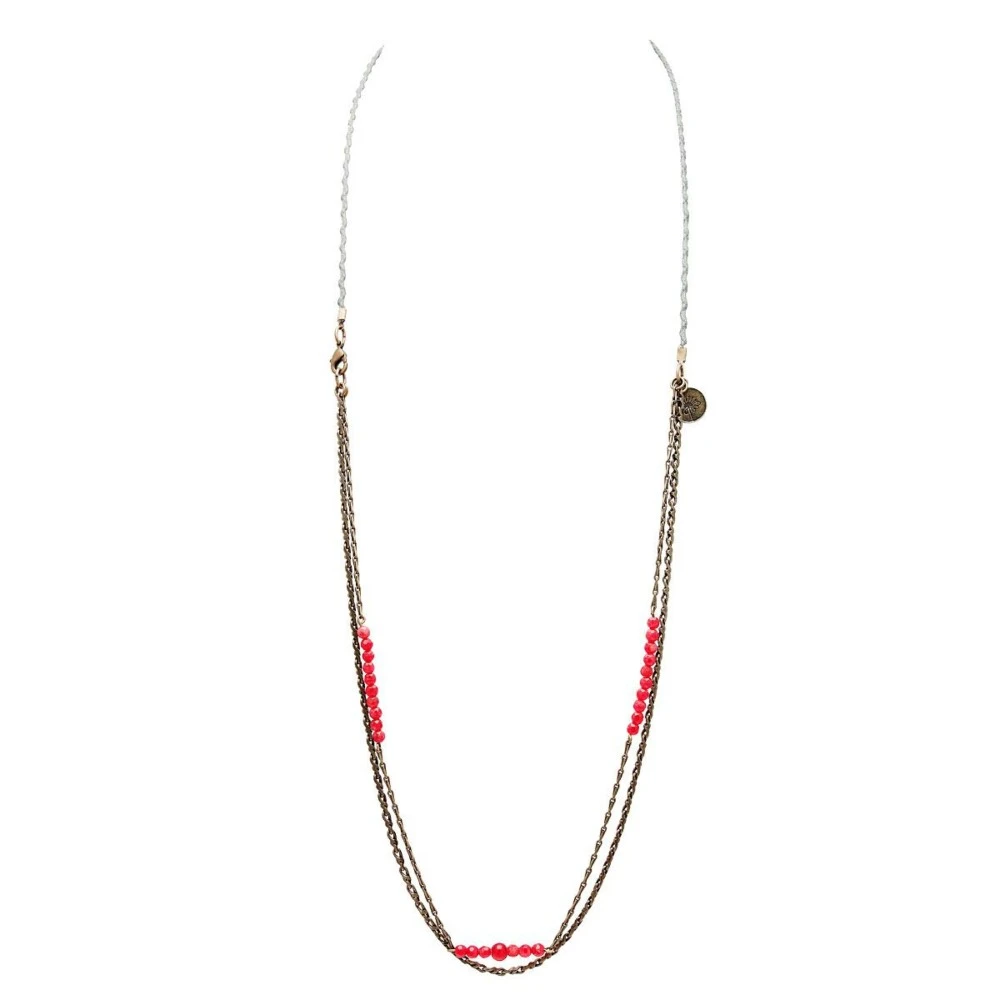 Ce sautoir, de la créatrice Louise Hendricks est le modèle « Dalia ». C’est un bijou de créateur, composé d’une double chaîne couleur bronze, agrémentée de pierres fines rose (serpentine). Rock et glamour, Il illumine vos tenues/