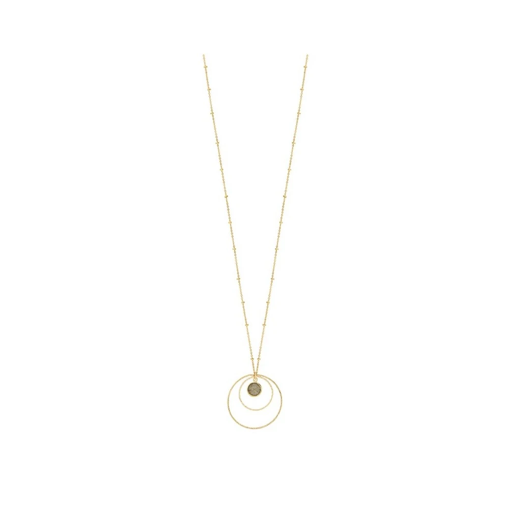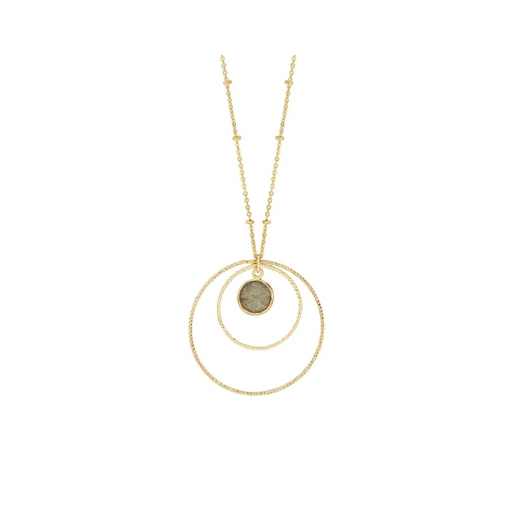 Ce sautoir en plaqué or 14 carats est signé Oscar Bijoux. Il est composé de deux pendentifs cercles et d’une pierre labradorite.