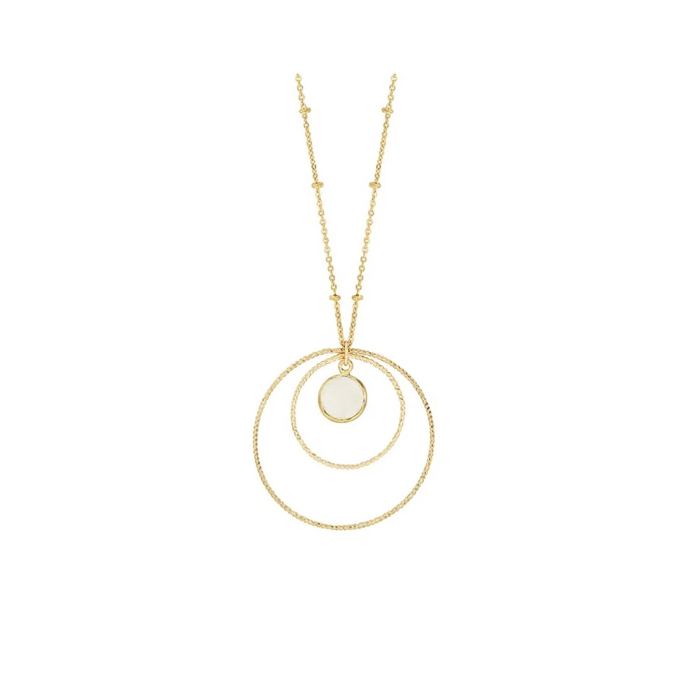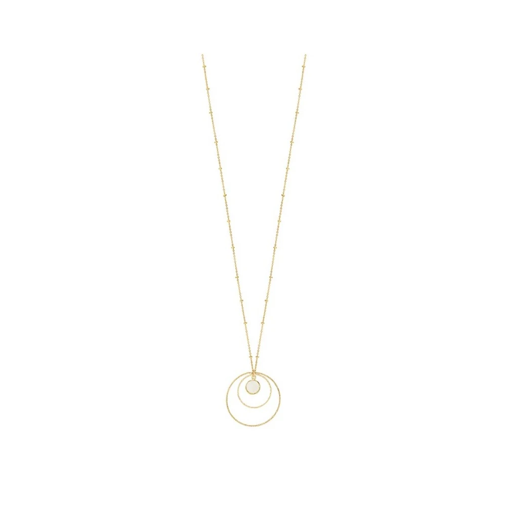 Ce sautoir en plaqué or 14 carats est signé Oscar Bijoux. Il est composé de deux pendentifs cercles et d’une pierre de lune de forme ovale.
