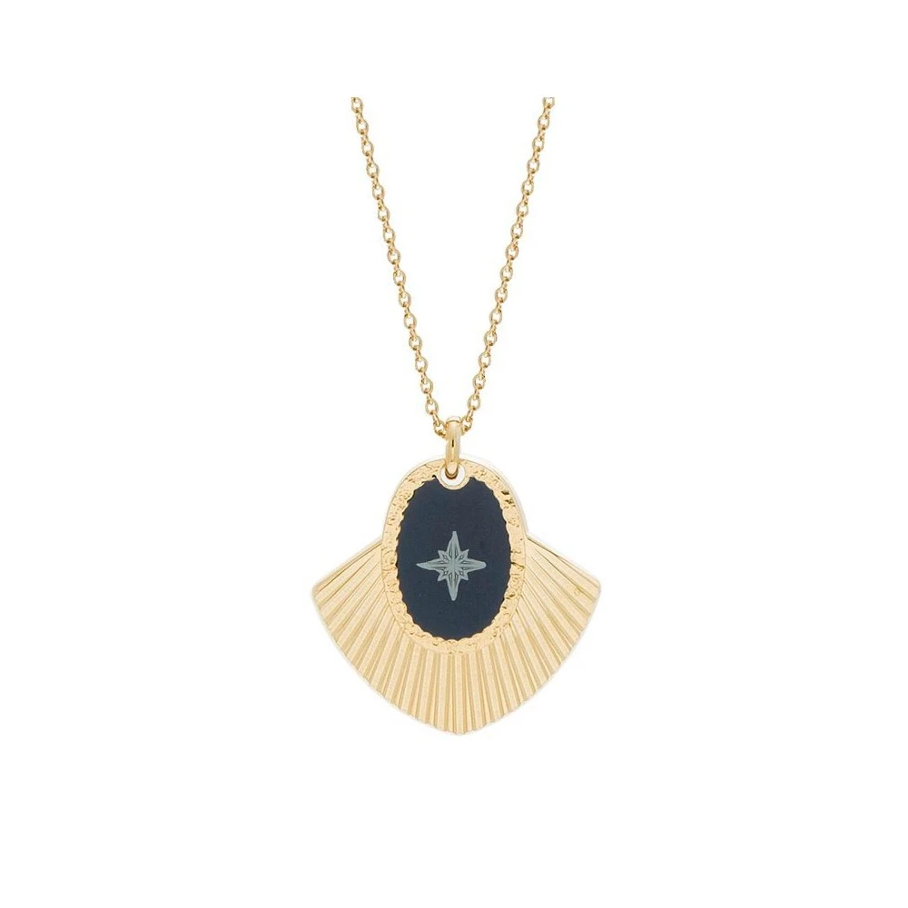 Ce sautoir en laiton trempé dans un bain d’or signé Lovely Day, se compose de deux médailles dont l’une est orné d’une rose des vents bleue.