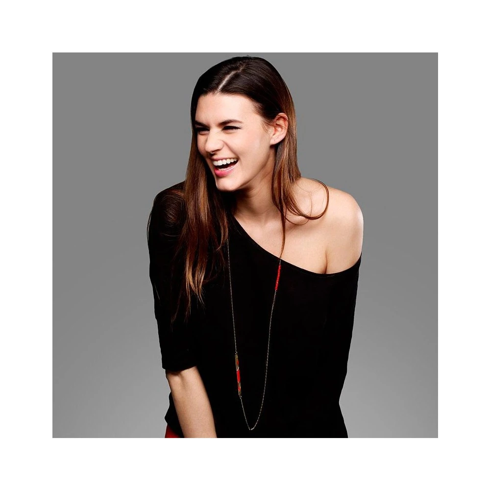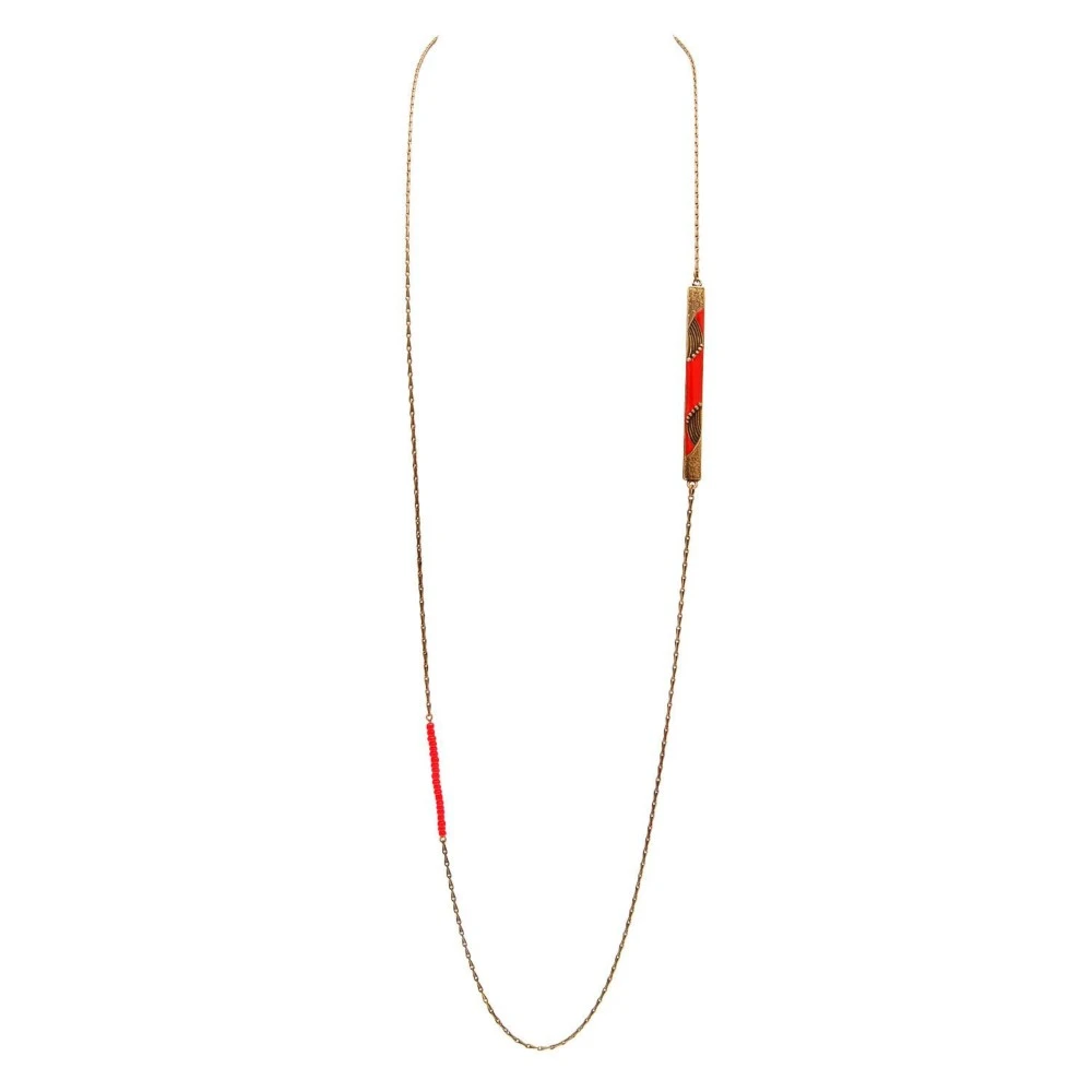 Ce sautoir de la créatrice Louise Hendricks est couleur bronze. D’un côté, une jolie tige design en email rouge et de l’autre, des petites perles rouge sont positionnées à des niveaux différents pour un bijou moderne et original.