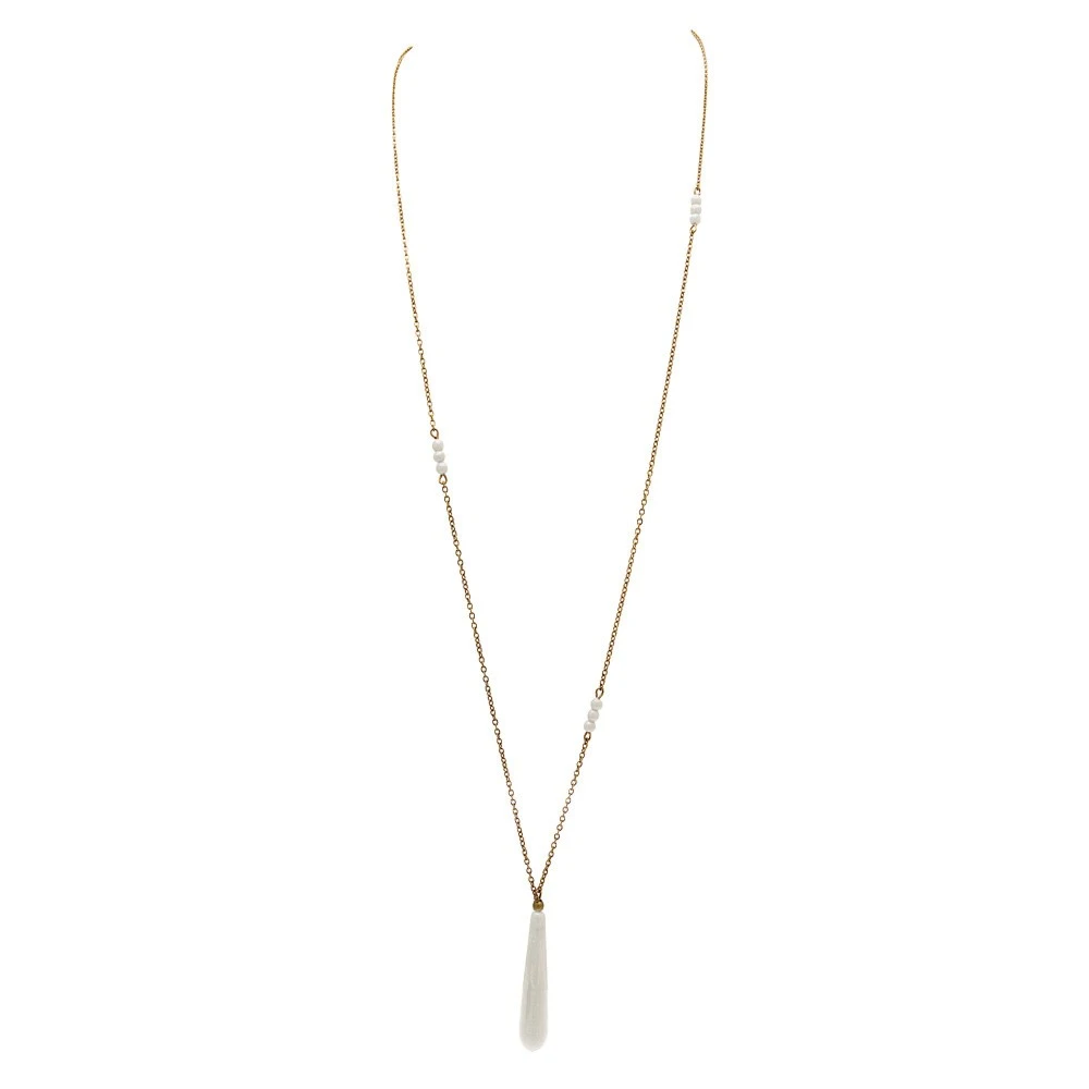 Ce sautoir pendentif de créateur est composé d’une fine chaîne bronze agrémentée de petites perles blanches disséminées avec raffinement et asymétrie le long du collier et au bout de laquelle est suspendue une longue goutte en perle de verre blanc cassé.l