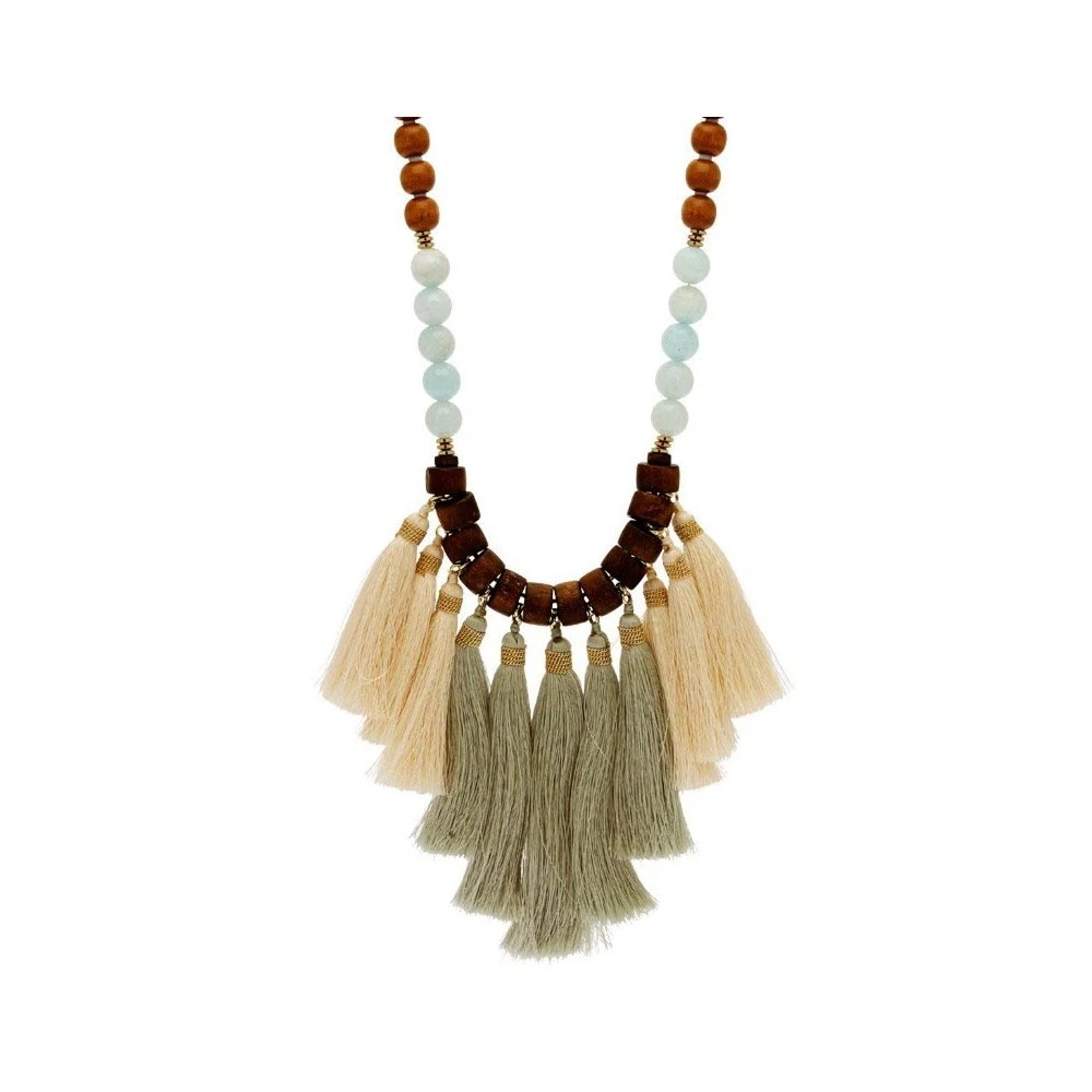 Ce sautoir Nakamol en laiton trempé dans un bain d’or est doté de gros pompons verts et beiges et de perles bois et bleues claires. Il est très volumineux et rentre dans la tendance ethnique de la saison.