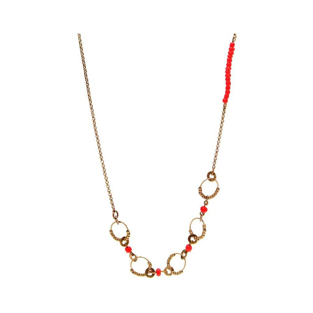 Signé Louise Hendricks, ce long sautoir est constitué d’anneaux de laiton teintés bronze entrelacés et de perles de rocaille corail et bronze. A la fois frais et élégant, il illuminera de ses notes de rouge corail ultra tendance, tous vos tops de saison!