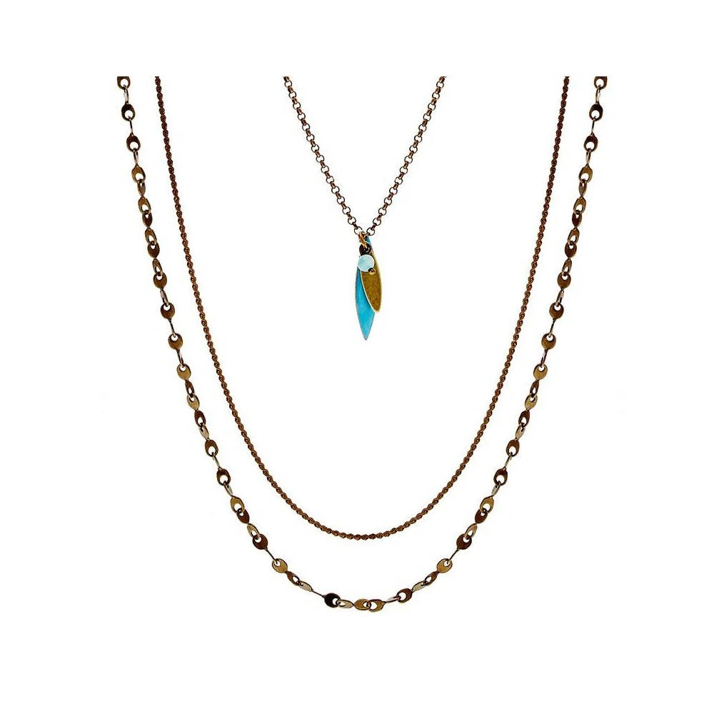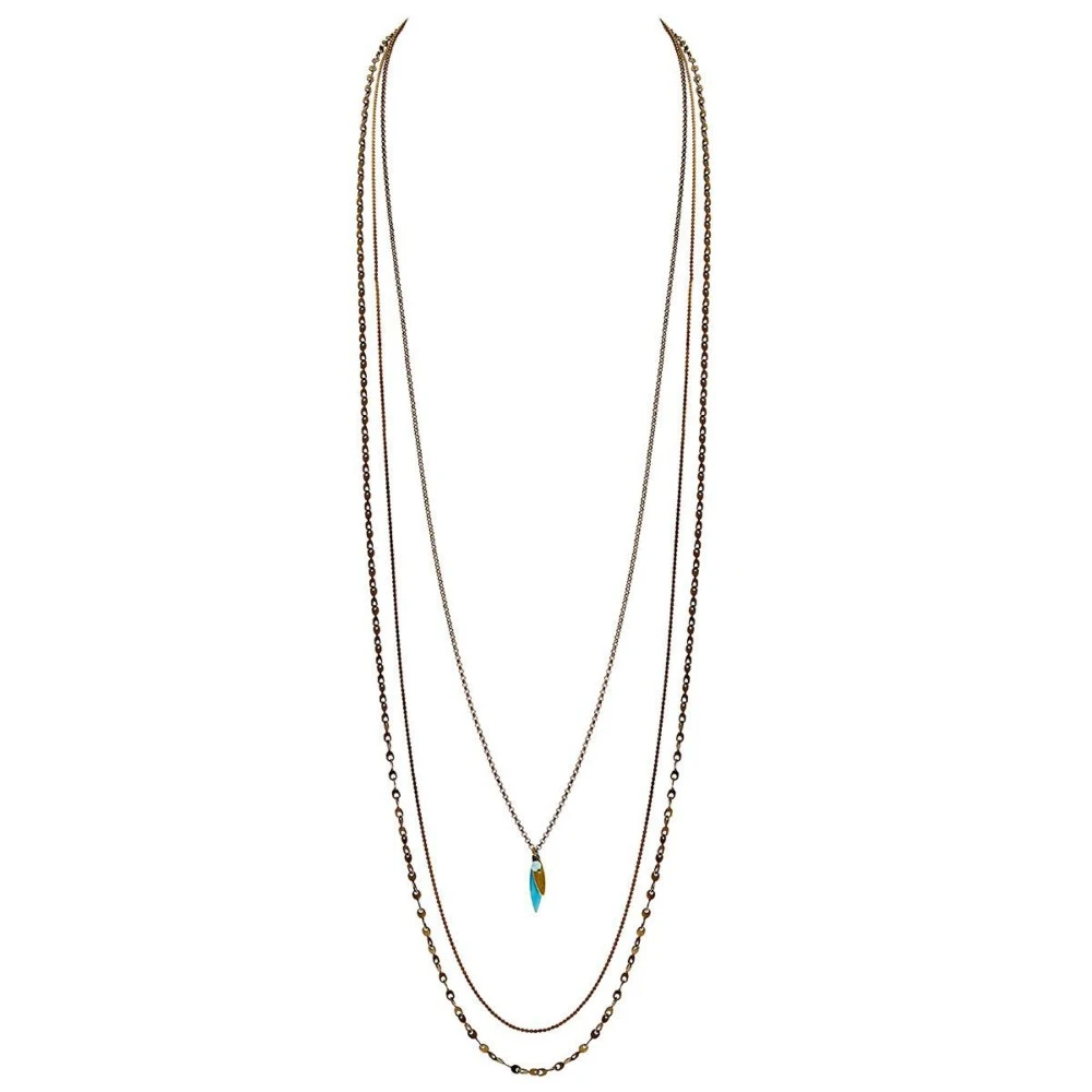 Ce sautoir de la collection Lucknow, triple-rangs, signé Amélie Sophie est composé de chaines en laiton de couleur bronze. Le rang le moins long est orné de navettes en métal agrémentée d’une perle en verre turquoise.