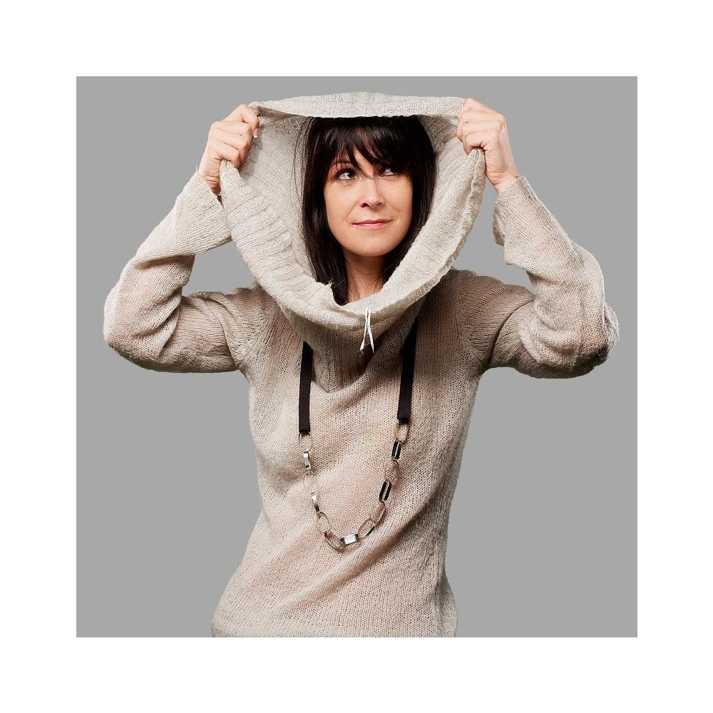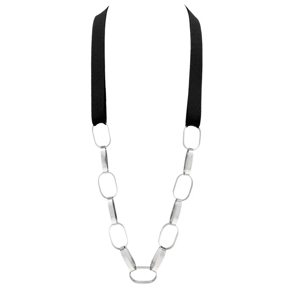 Ce sautoir est hors du commun et très stylé. Il est composé de chaque côté d’un double ruban noir au milieu desquels sont accrochés de gros maillons. Ce collier de créateur se noue à la hauteur souhaitée et affiche un esprit rock très affirmé. Le ruban apporte la note féminine et donne l’équilibre face au côté masculin des maillons enchevêtrés.