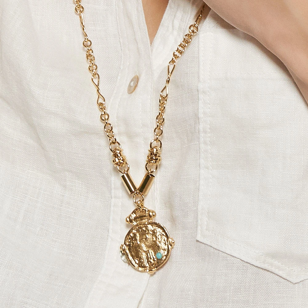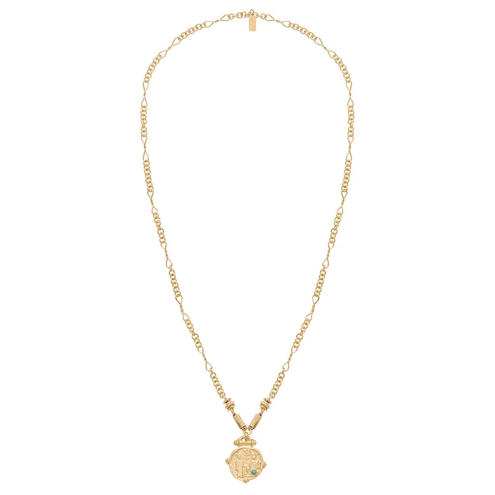 Ce sautoir est doré à l’or fin 18k et est signé Virginie Berman, il est composé de maillons épais et travaillés avec un pendentif pièce antique ornée d’une petite pierre turquoise.