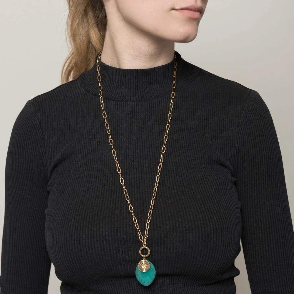 Il est composé d’une chaîne maillons, d’une pierre en agate turquoise et d’une médaille soleil.