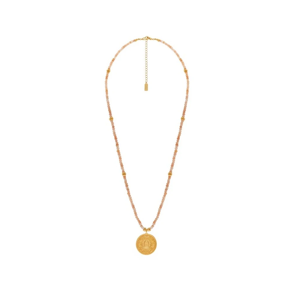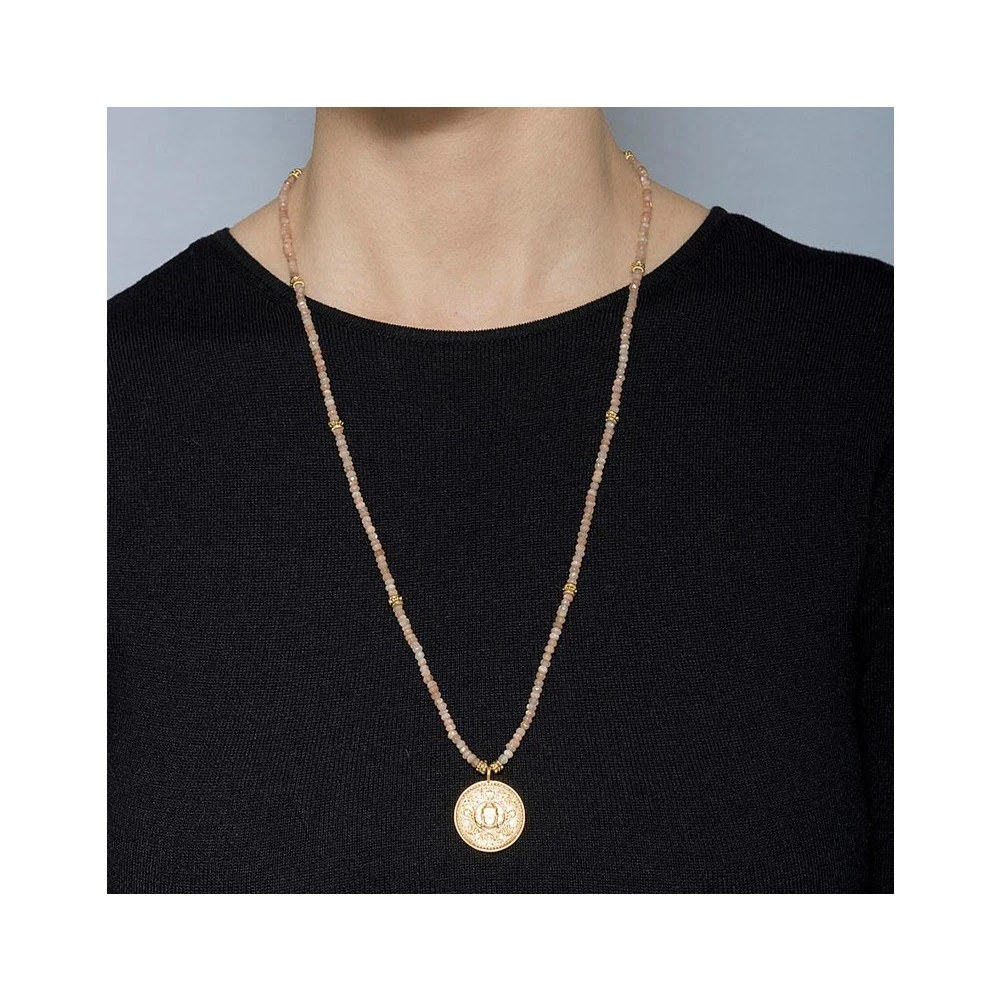 Ce sautoir de la collection Karma est signé Leticia Ponti. Il est composé de pierres de lune rose et d’une médaille représentant bouddha.