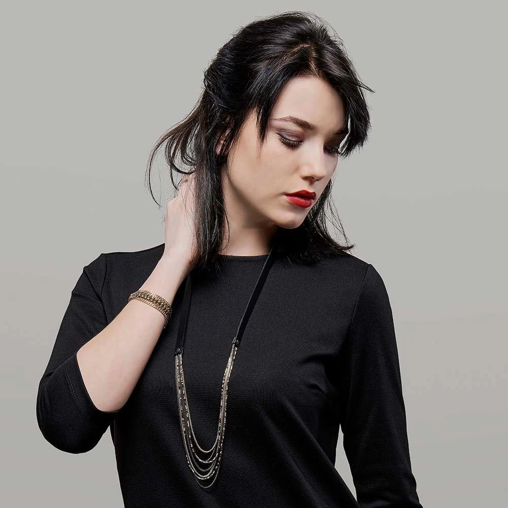 Ce sautoir multi-chaines de la créatrice Sev Sevad est composé d’une multitude de chaines gun et dorées reliées entre elles par une lanière en cuir de vachette. Cette composition donne à ce bijou un style rock et glamour !