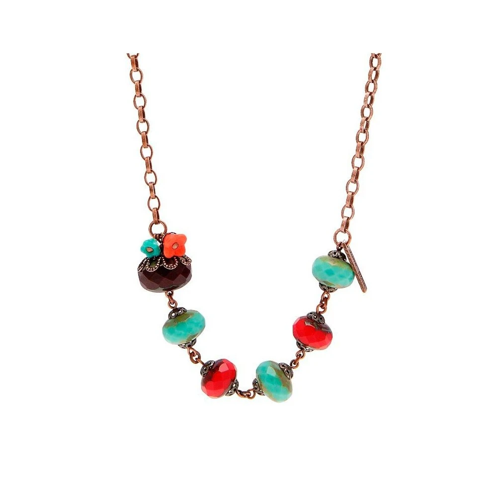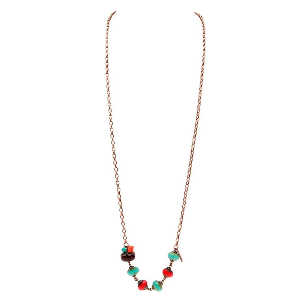 Ce long sautoir signé Julie Sion, en chaine de laiton cuivré avec au centre des boules bleu turquoise et rouge (perles de verre facetées) est particulièrement coloré, avec des couleurs qui contrastent et apportent du peps aux tenues.