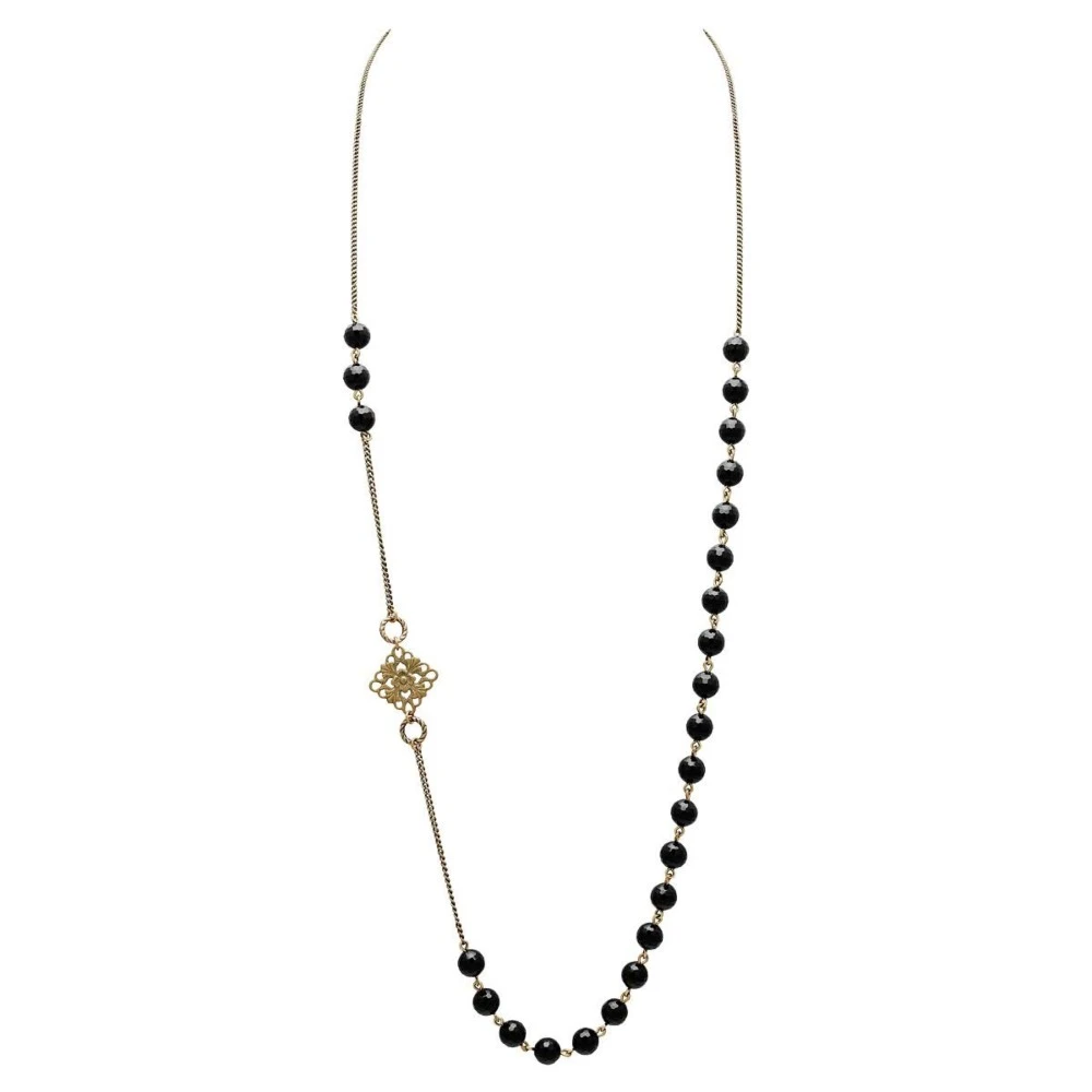 Ce bijou est tout simplement magnifique, composé de perles facettées en onyx noir et d’une estampe teintée bronze, il saura faire son effet au quotidien. Nous vous conseillons de l’arborer avec des tenues simples pour le magnifier.