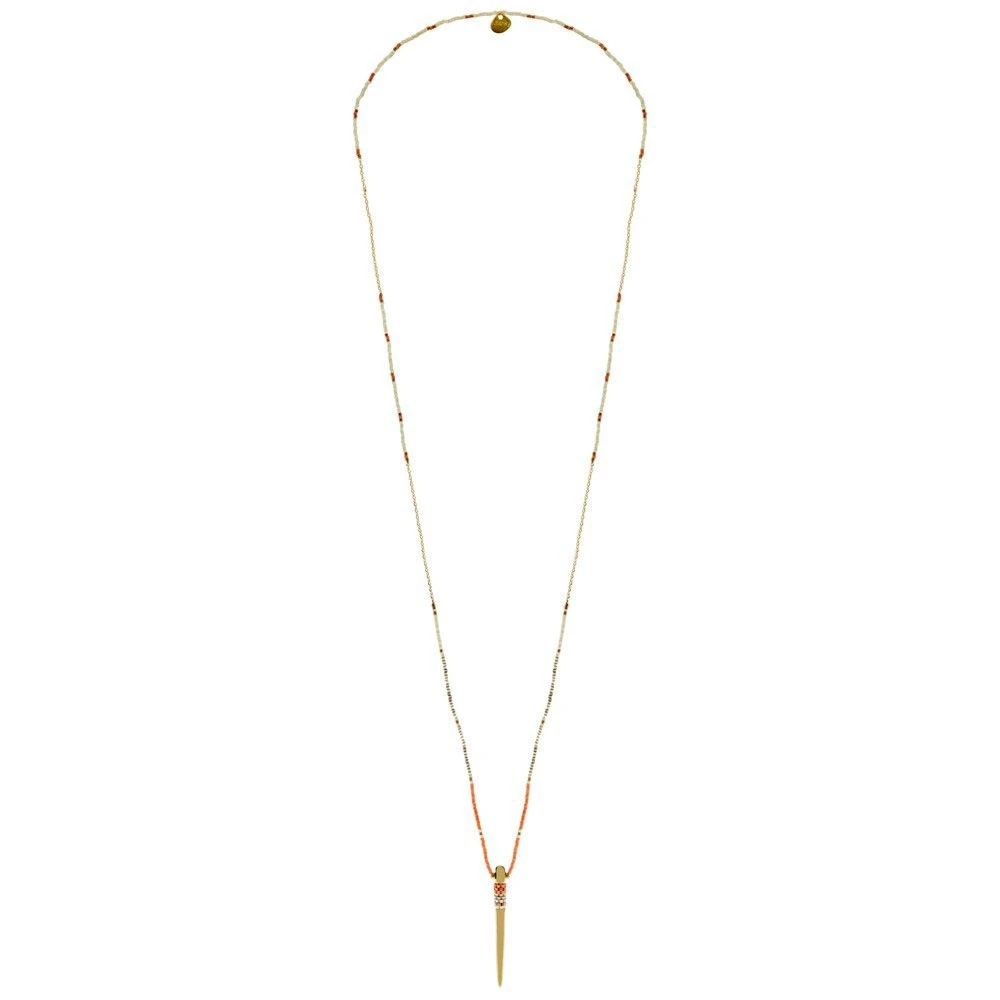 Ce sautoir en plaqué or de Misky est doté de pierres rocailles beige et corail. Il est également serti d’un pique doré. Ce sautoir existe aussi en plusieurs coloris