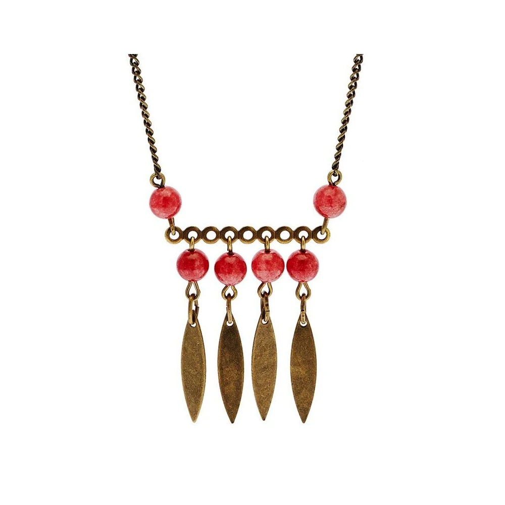 Ce sautoir, signĂ© Florence Pavec, est en laiton teintĂ© bronze. Il est agrĂ©mentĂ© de six pierres roses et de quatre navettes en forme de feuilles. Adoptez ce sautoir Ă l’esprit trĂšs printanier.