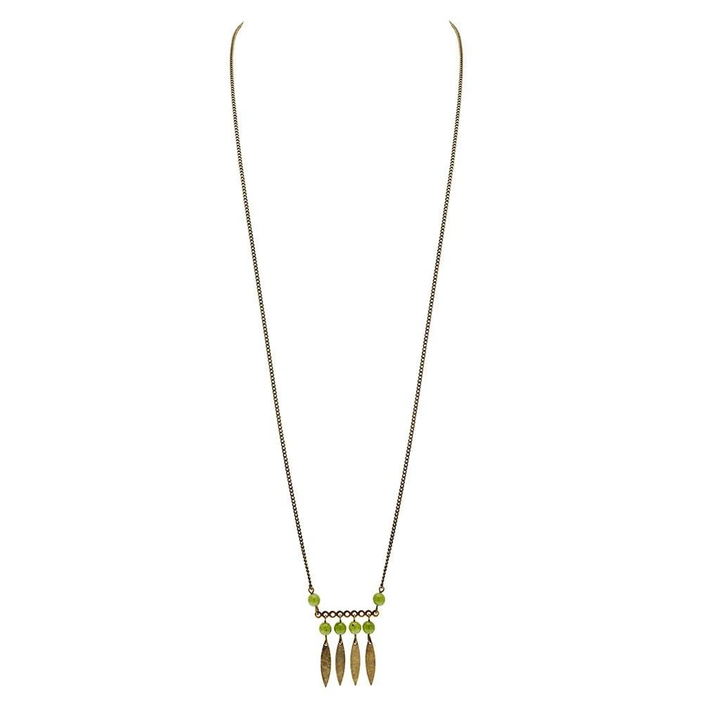 Ce sautoir, signé Florence Pavec, est en laiton teinté bronze. Il est agrémenté de six pierres vertes et de quatre navettes en forme de feuilles. Adoptez ce sautoir à l’esprit très printanier.