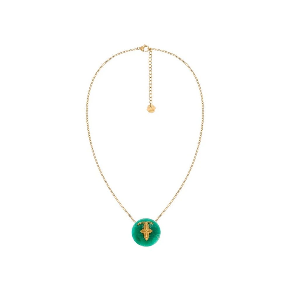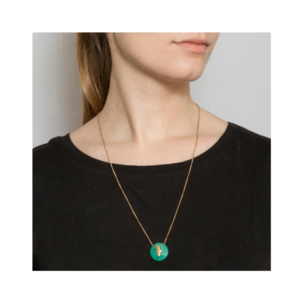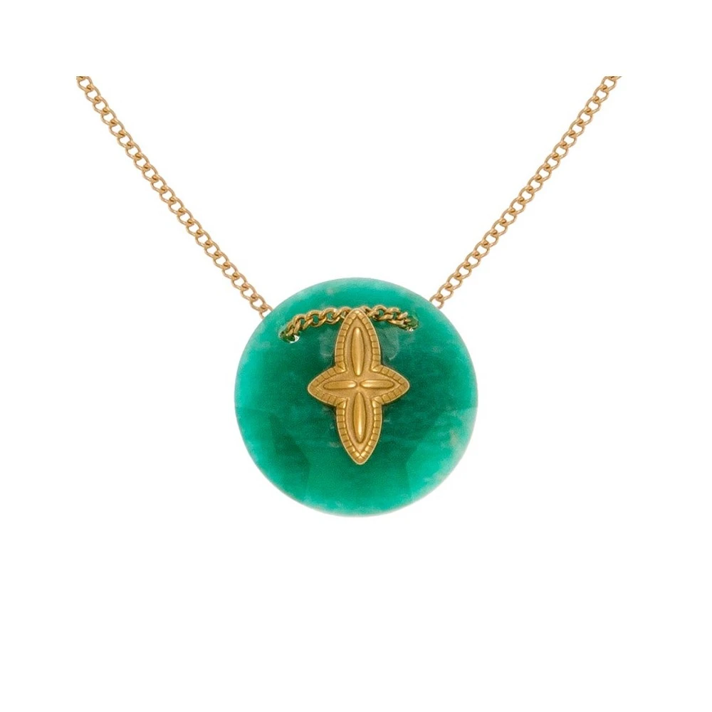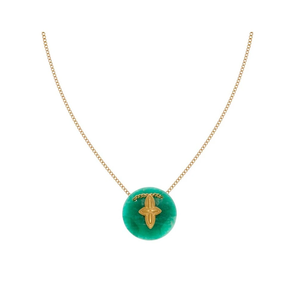 Ce sautoir en acier chirurgical trempé dans un bain doré de la collection Siloé est signé EME Paris. Il est composé d’un pendentif pierre en amazonite orné d’une croix.