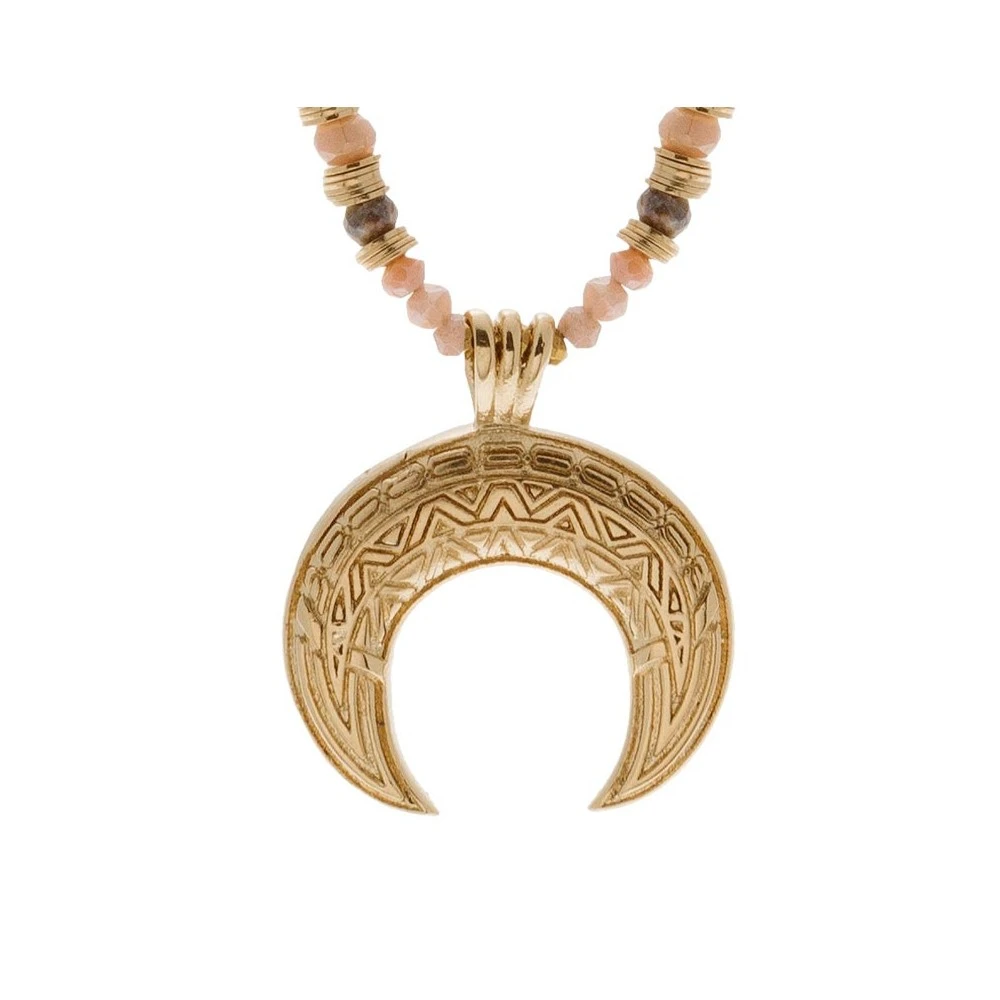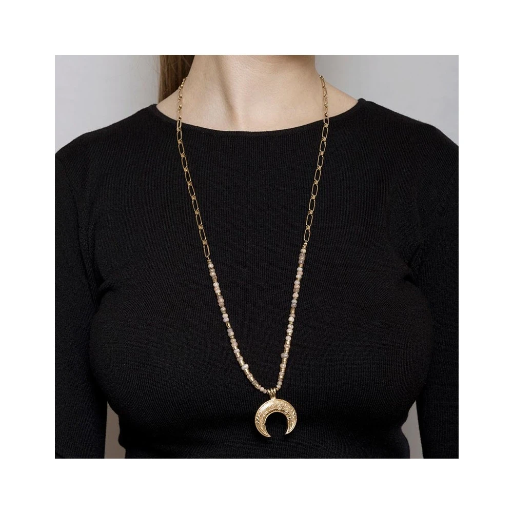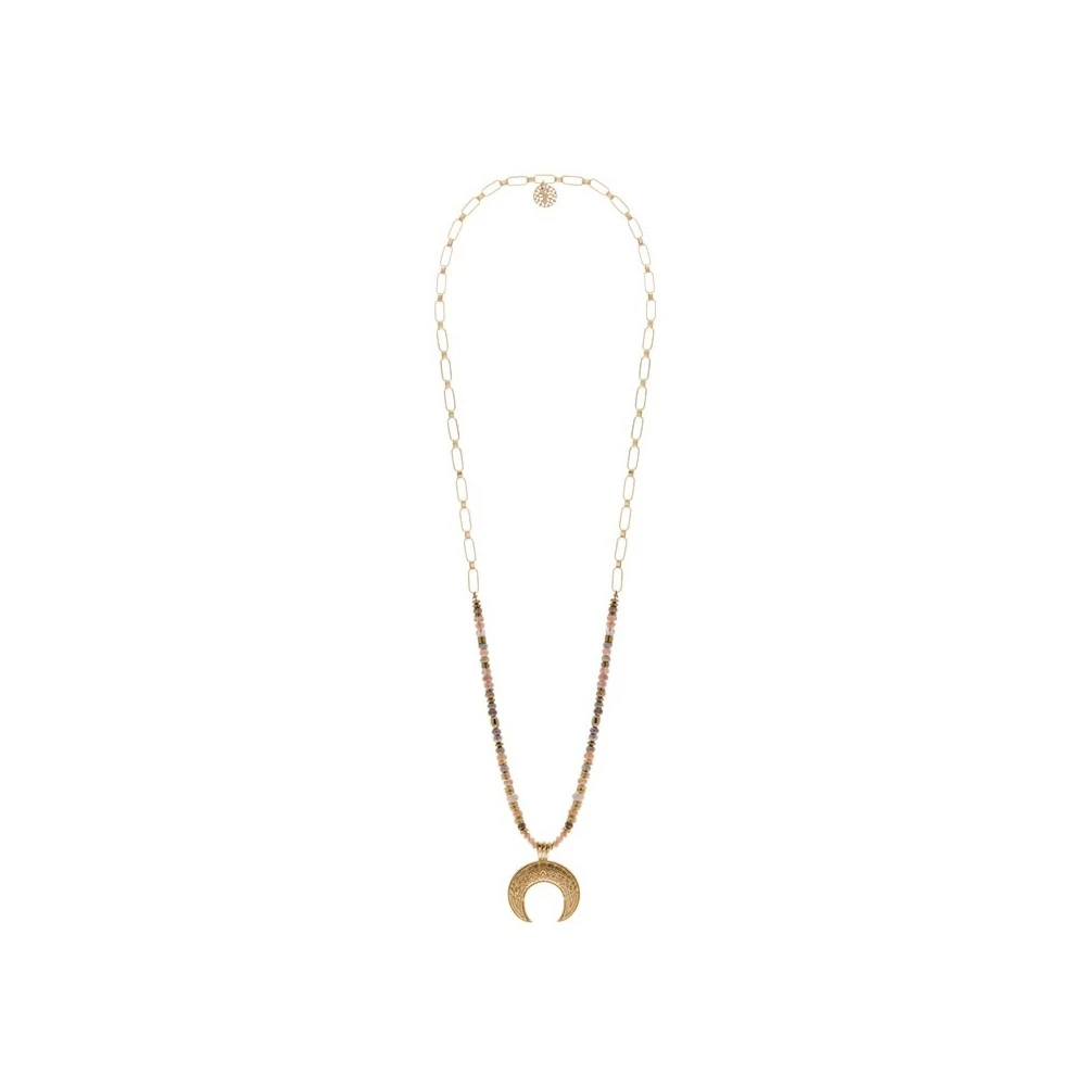 Ce sautoir est signé Tungstène. Il est en laiton trempé dans un bain d’or, et orné de multipierres fines en quartz, hématite, et pierre de lune.