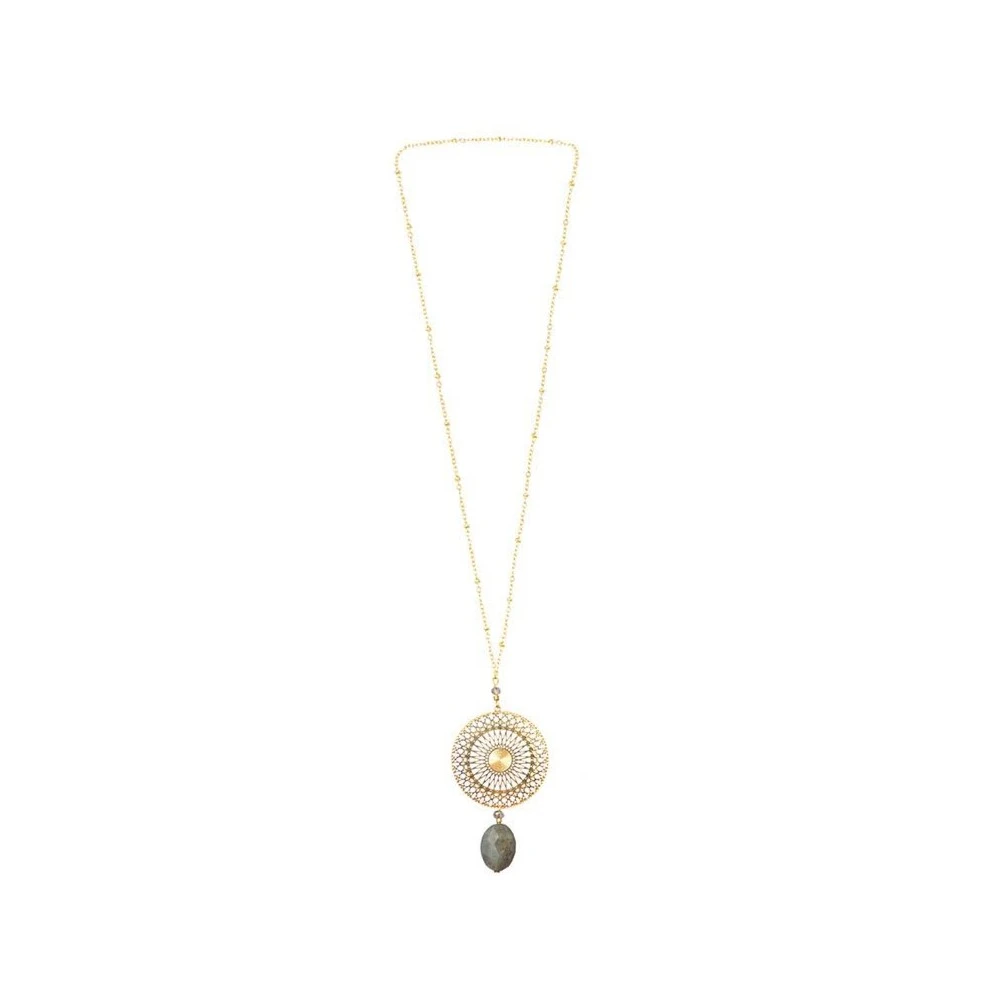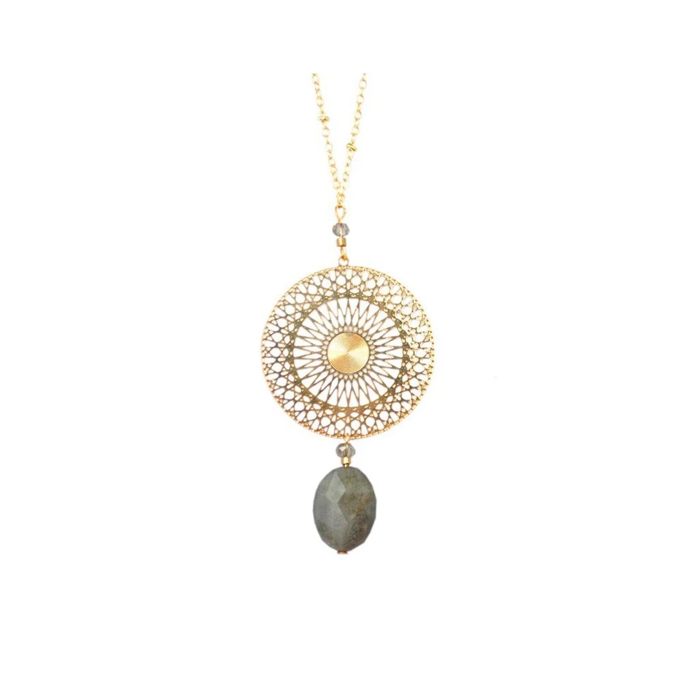 Ce sautoir en plaqué or 14 carats est signé Oscar Bijoux. Il est composé d’un pendentif rosace décoré d’une pierre naturelle grise.