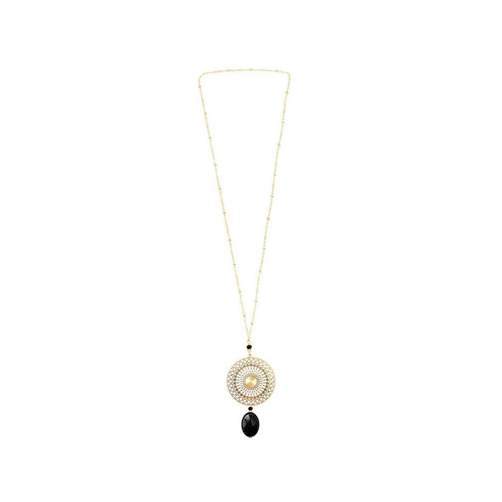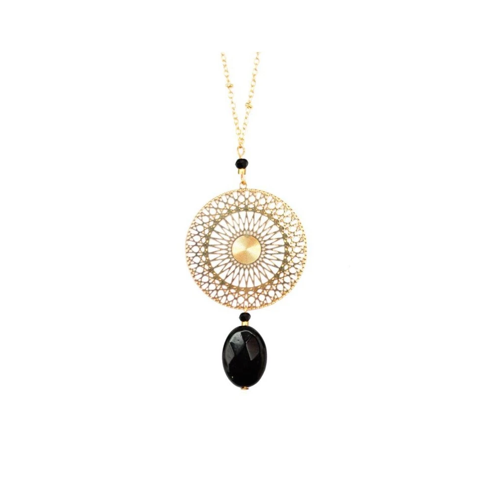 Ce sautoir en plaqué or 14 carats est signé Oscar Bijoux. Il est composé d’un pendentif rosace décoré d’une pierre naturelle noire.