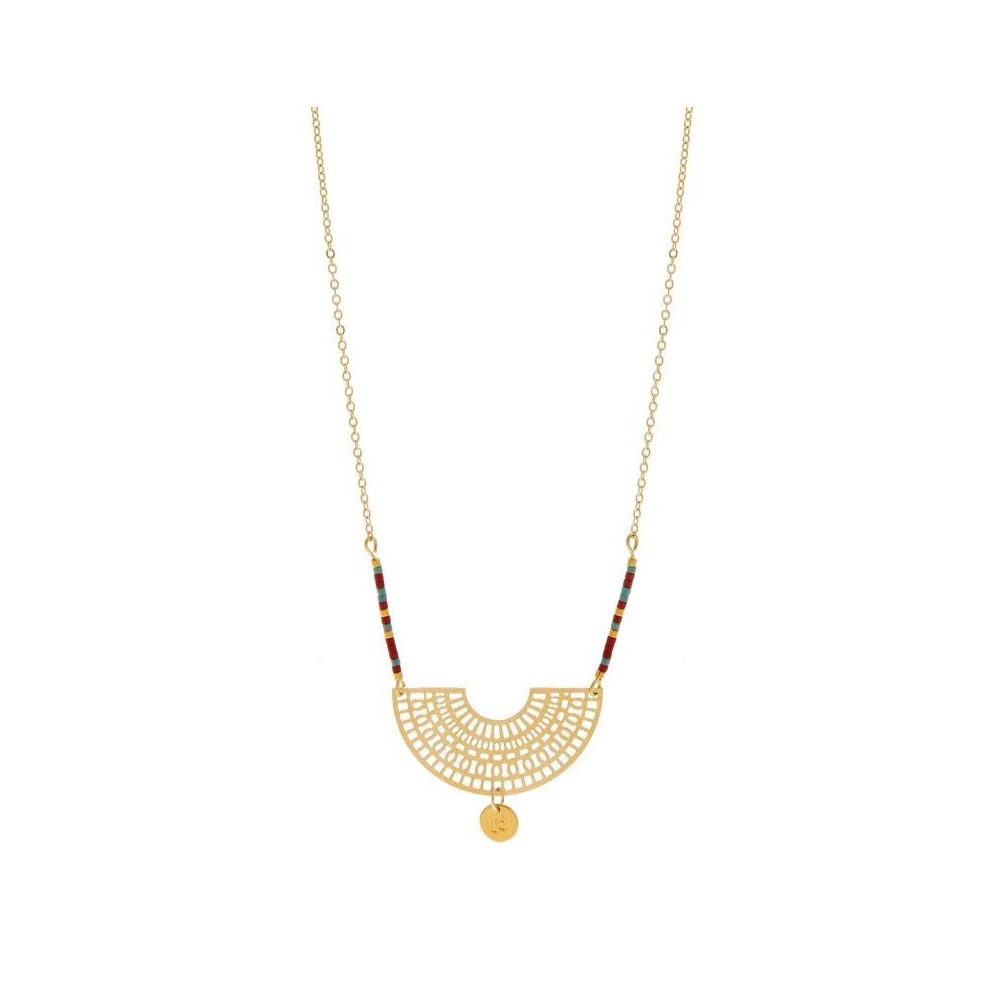 On raffolera de la touche ethnique et tendance apporté par ce sautoir de Les Dissonances. Accroché à des mailles d’or fin 24K, le pendentif en rosace en forme de demi lune resplendira vos tenues à souhait. Les perles de couleurs rouge et bleu sauront apporter la touche indéniablement irrésistible à votre garde-robe. Longueur 43cm.