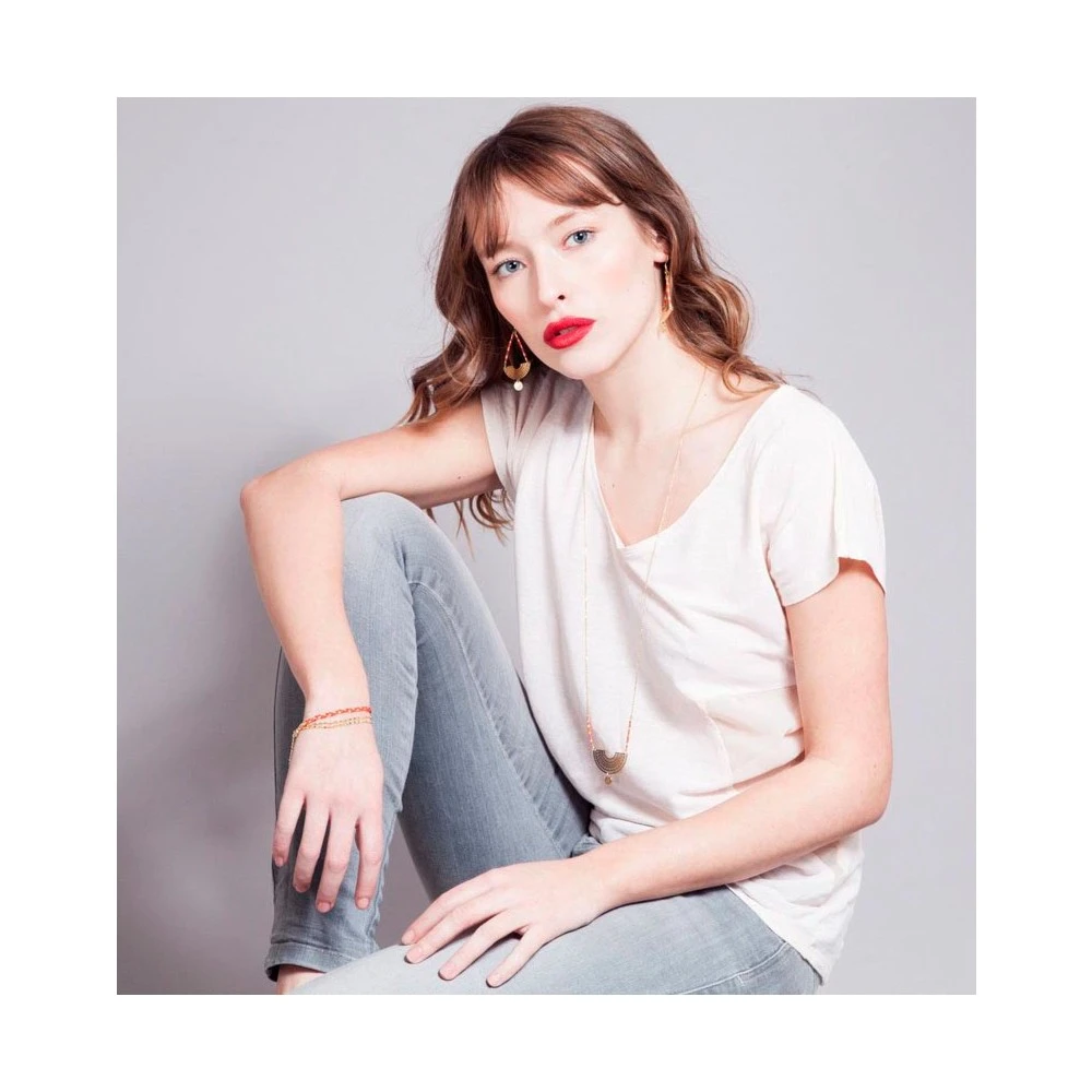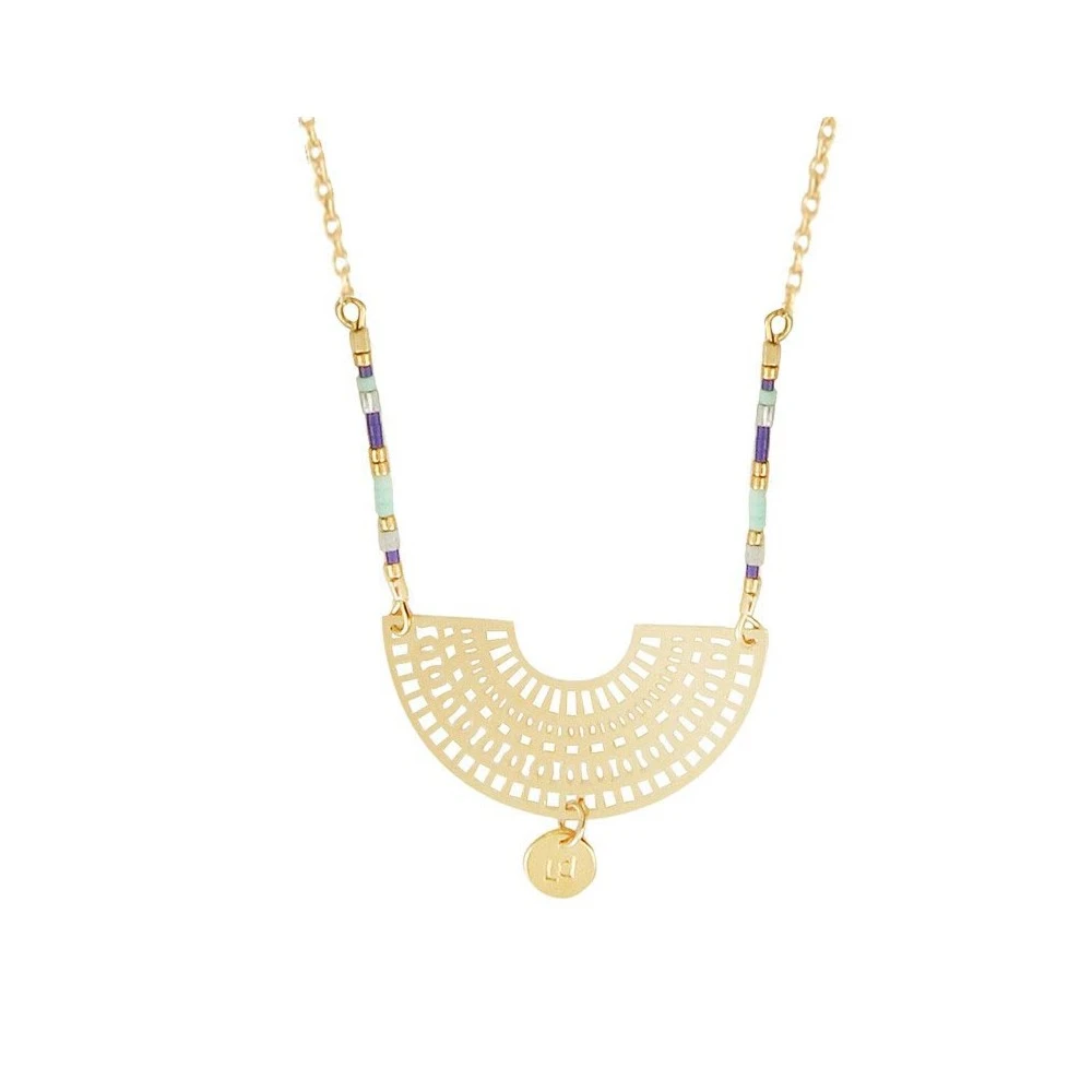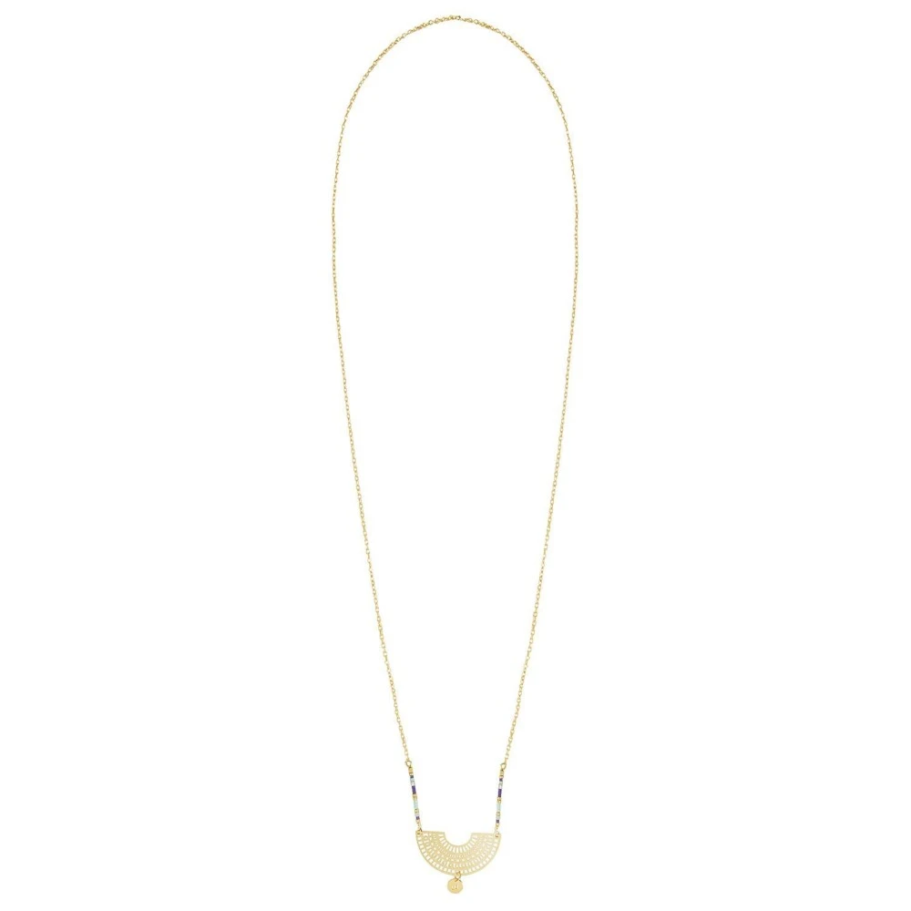 Elégant à souhait, ce sautoir est peint à l’or fin 24K, nouveauté inédite de la gamme Santa Cruz, Les Dissonances. Il se compose de maillons fins, de jolies petites perles turquoises et d’une rosace en forme de demi lune. Il est disponible en plusieurs coloris. Retrouvez le bijou-logo de la marque au début de la chaîne de réglage. Un bijou d’exception qui va faire des jaloux !