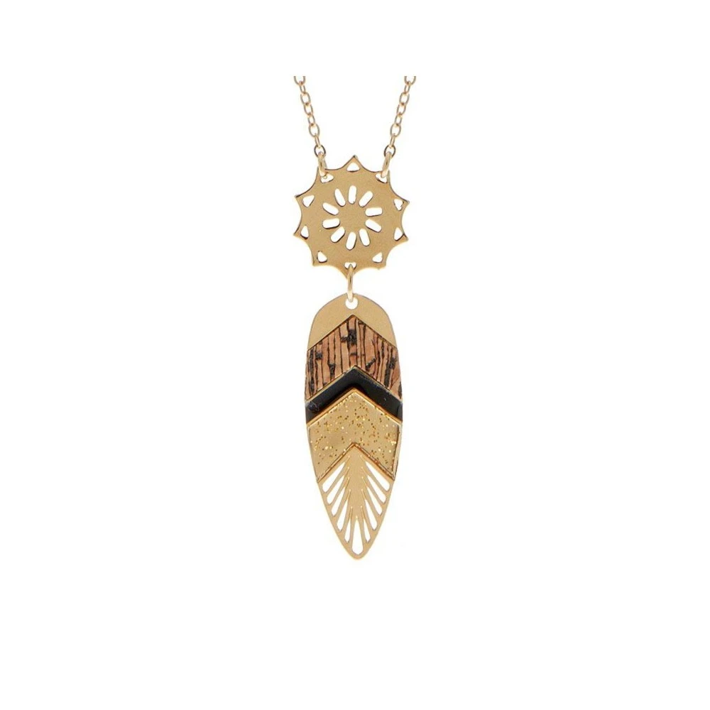 Ce sautoir apache de notre créatrice Laëti Trëma mélange élégance et douceurs des bois. Sa fine chaîne est ornée d’une plume d’oiseau du paradis à motifs ajourés dorés, email pailleté et bois craquelé. Cette collection aux coloris contrastés et impertinents appelle aux désirs féminins.