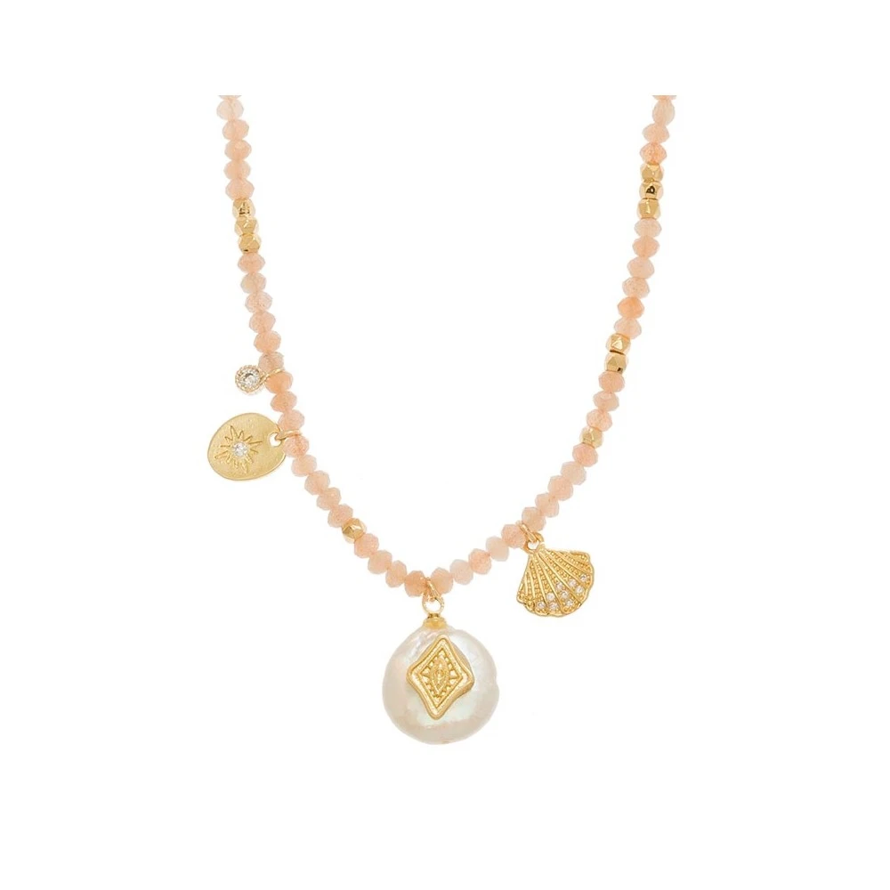 Composé de pierres semi-précieuses, de pépites dorées à l’or fin, d’un pendentif en nacre.