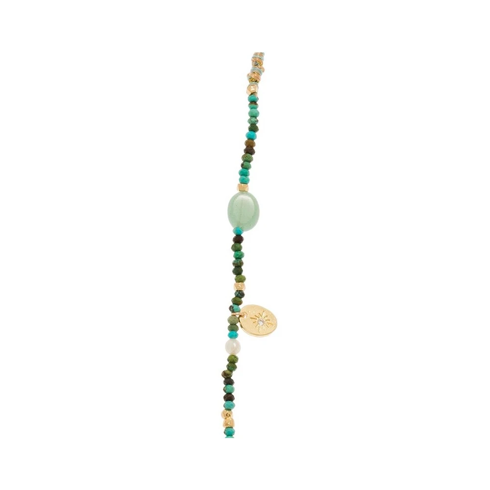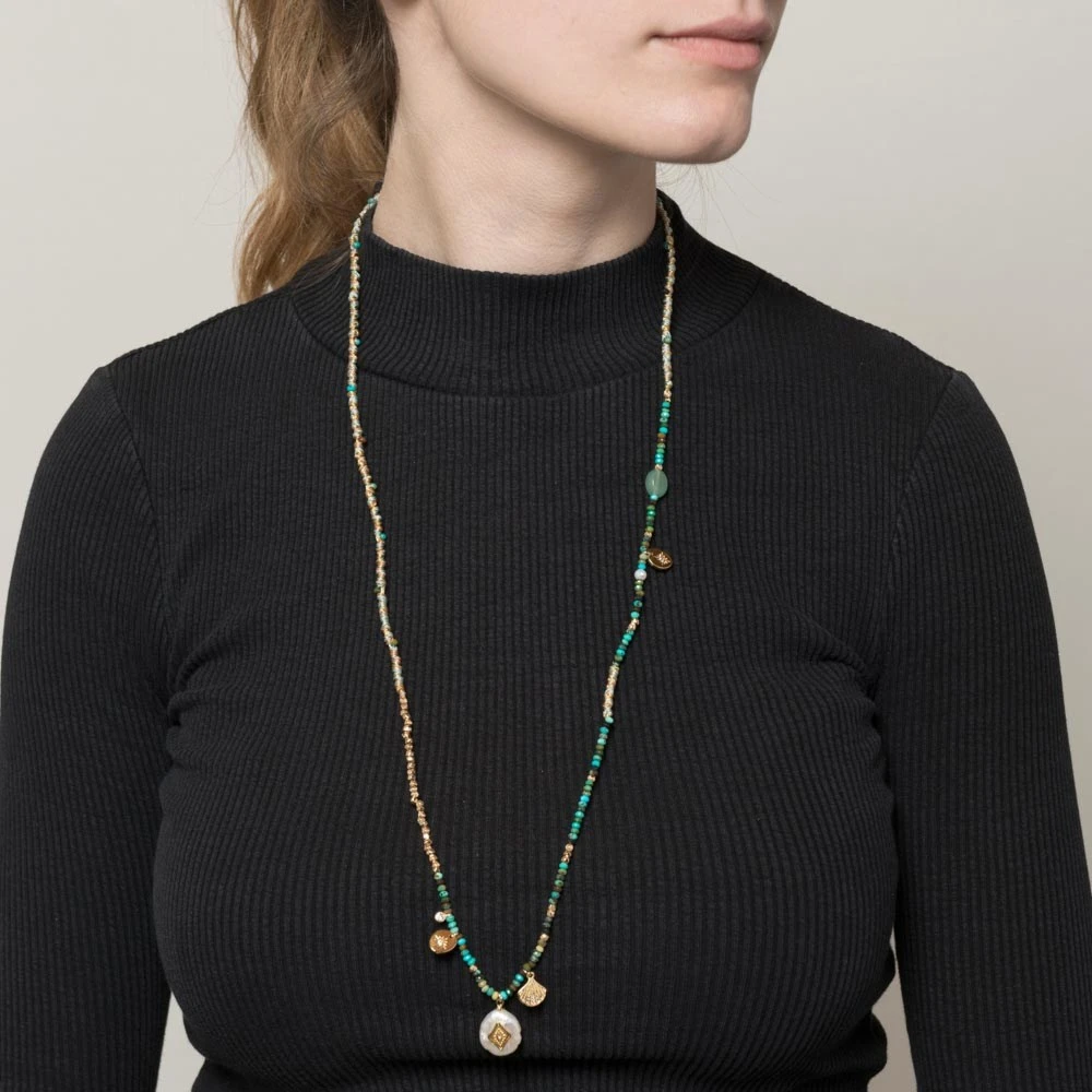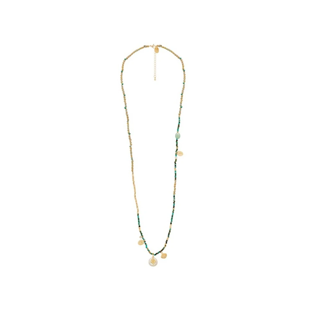 Composé de pierres semi-précieuses, de pépites dorées à l’or fin, d’un pendentif en nacre.