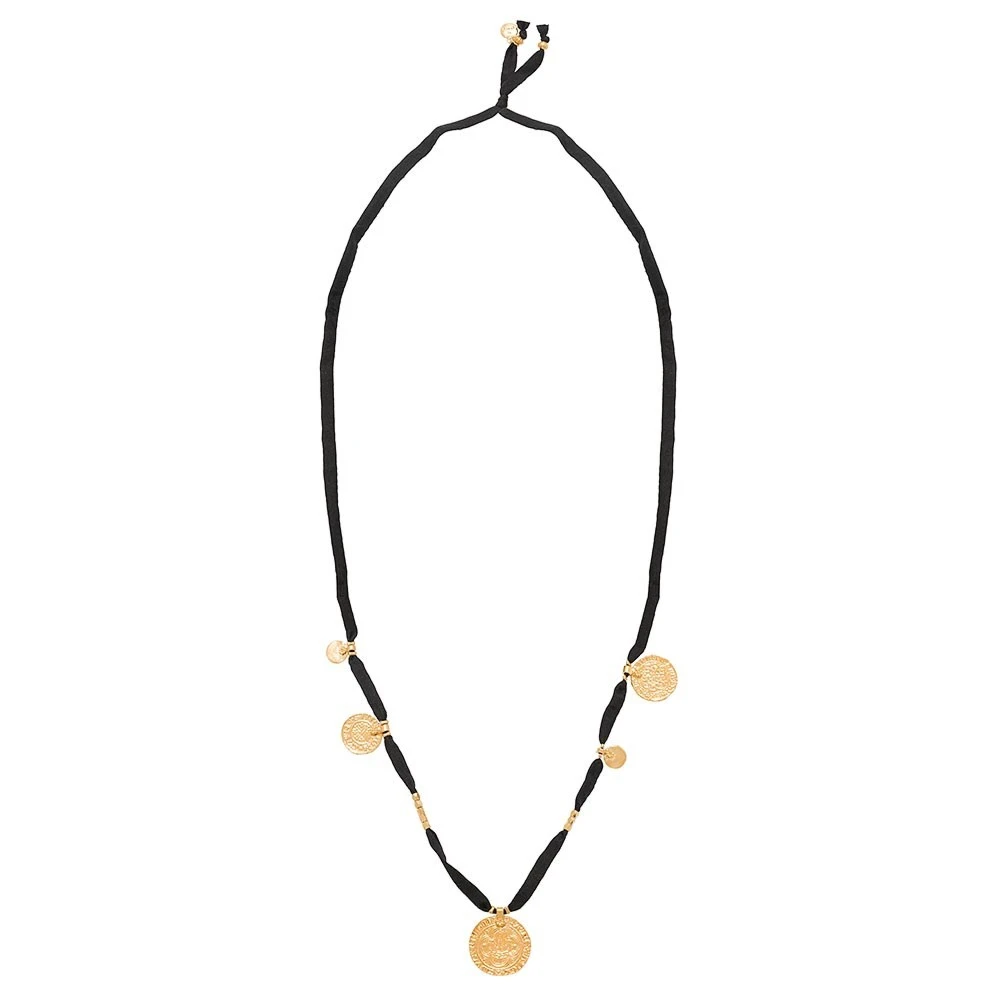 Sautoir en soie noire et médailles gravées en laiton trempé dans un bain d’or signé By Garance.