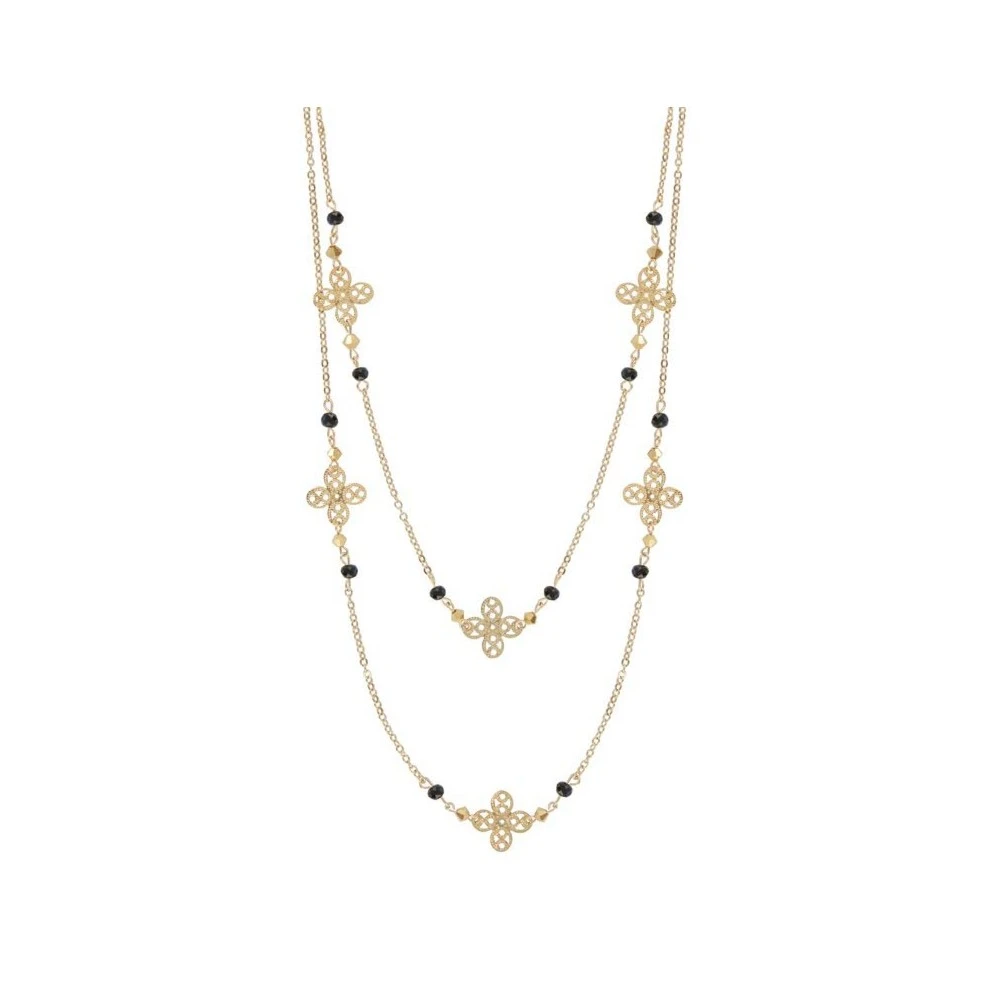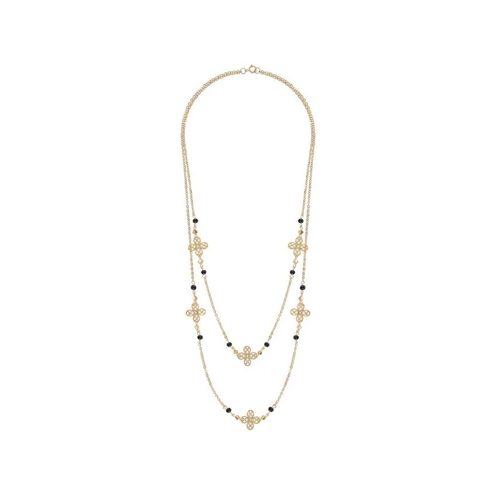 Ce sautoir en plaqué or 14 carats est signé Oscar Bijoux. Il est composé de plusieurs trèfles ajourés et de perles de cristal noires et dorées.