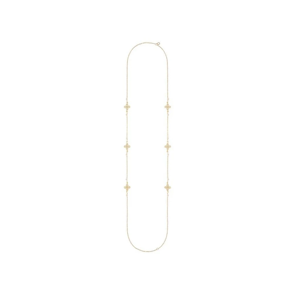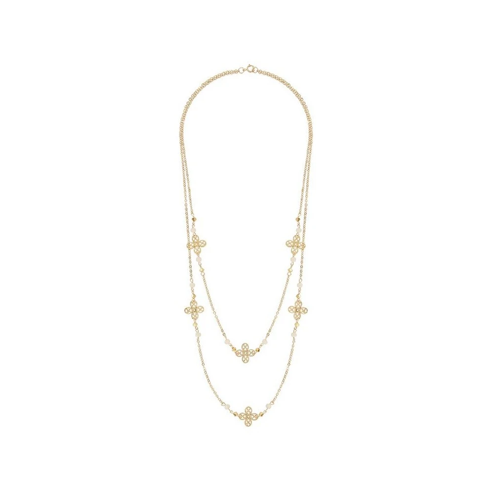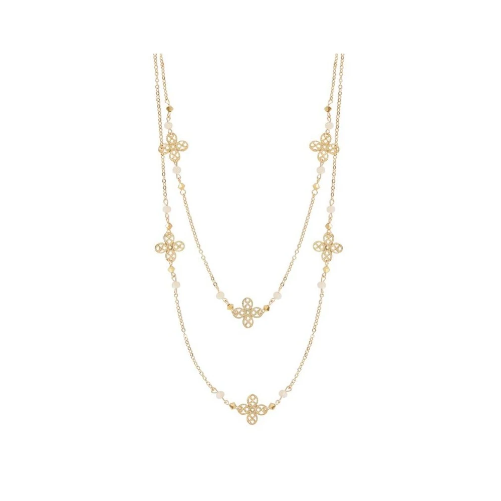 Ce sautoir en plaqué or 14 carats est signé Oscar Bijoux. Il est composé de plusieurs trèfles ajourés et de perles de cristal nudes et dorées.