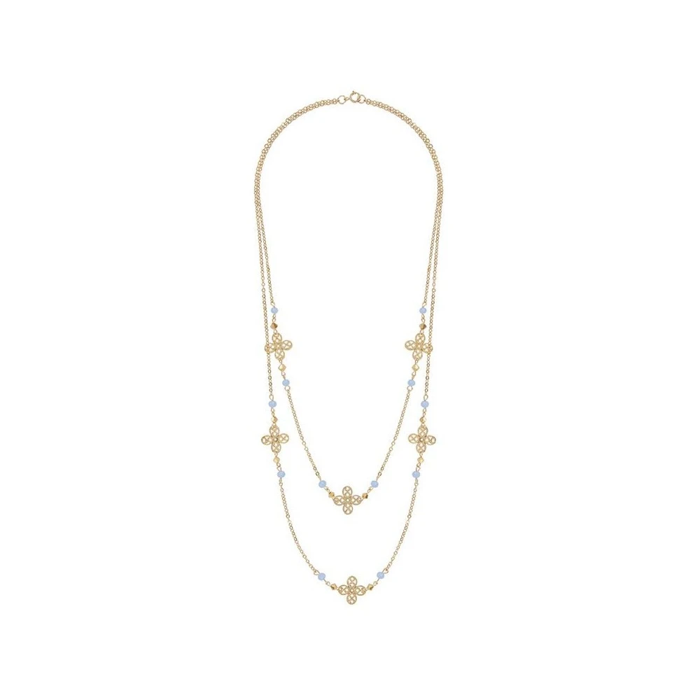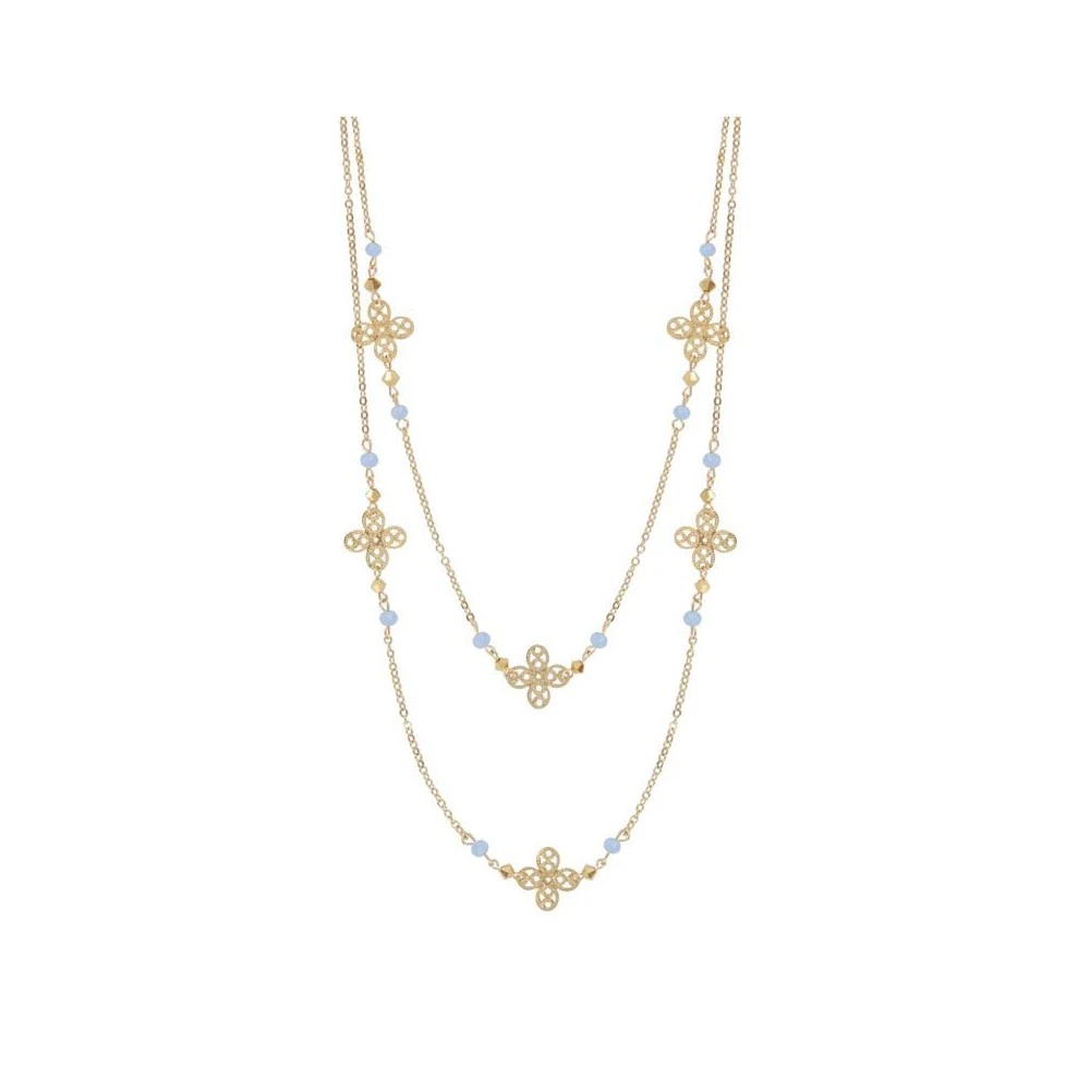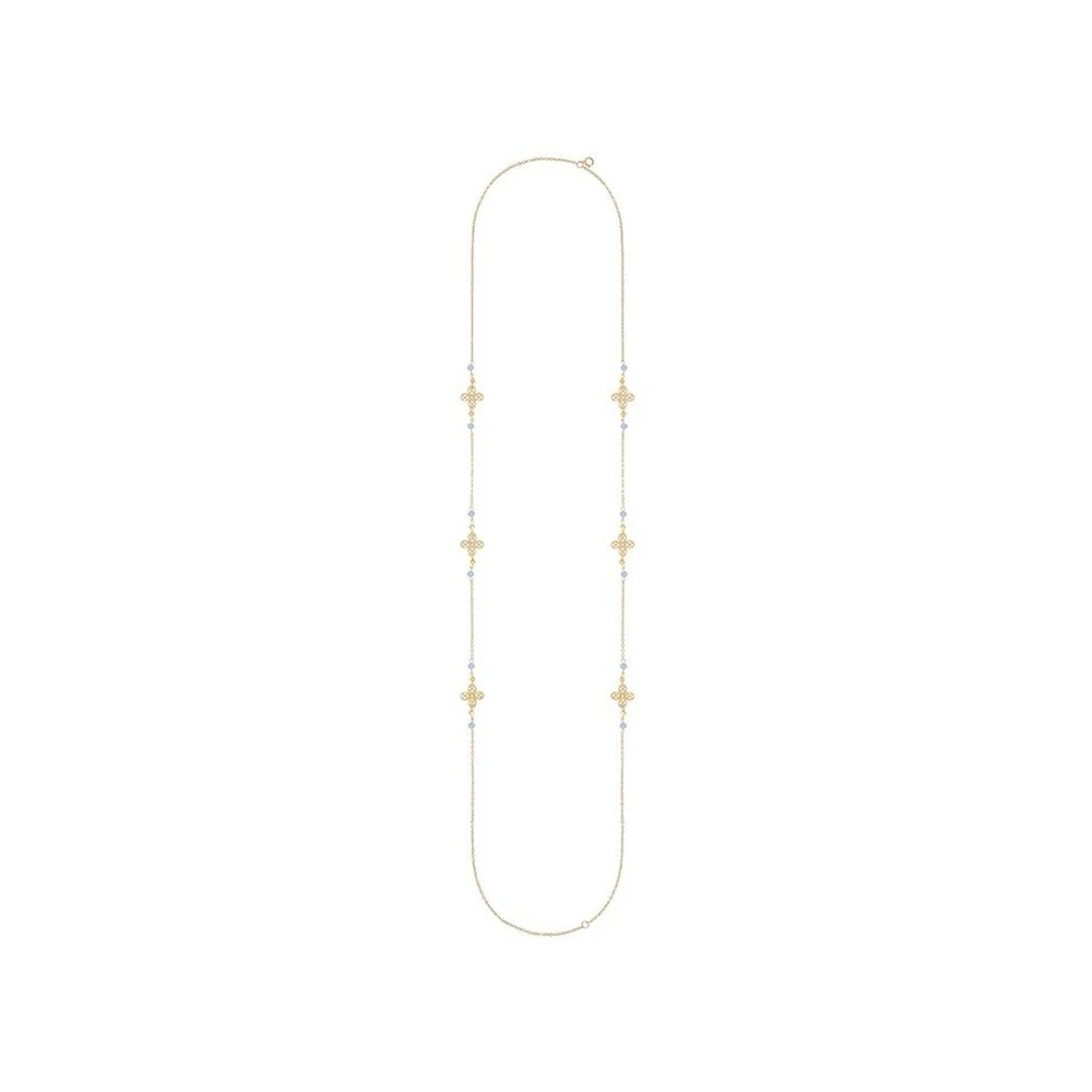 Ce sautoir en plaqué or 14 carats est signé Oscar Bijoux. Il est composé de plusieurs trèfles ajourés et de perles de cristal turquoises et dorées.