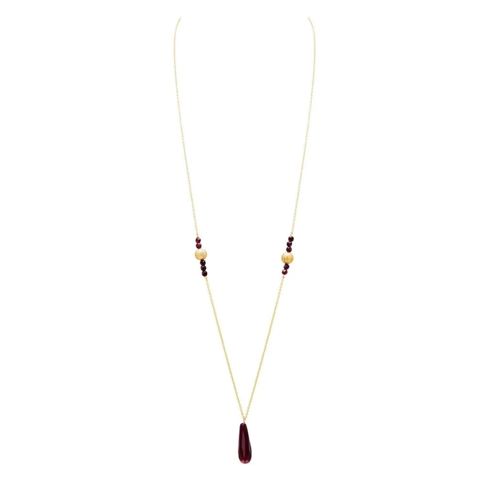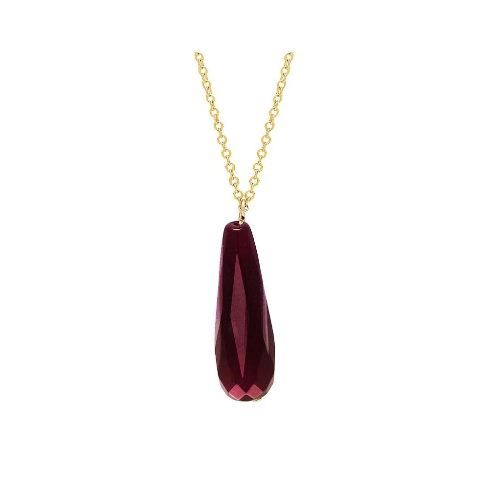 Ce bijou doré à l’or fin est composé d’une longue et fine chaîne à laquelle est suspendu un pendentif violet en forme de goutte (pierre fine: agate). Les belles perles facettées violettes sur chaque côté du sautoir encadrent une boule dorée.