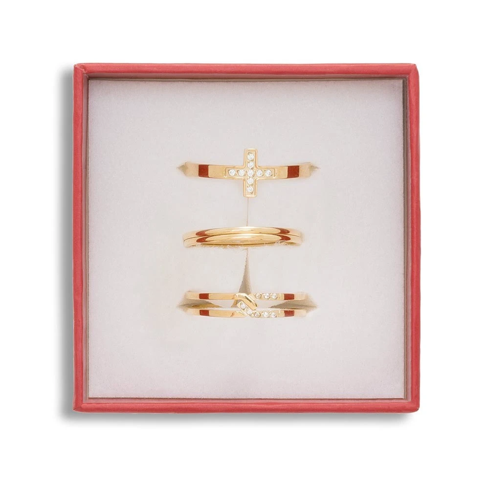 Ce set de bagues signé Siloé est composé d’une bague ornée d’une croix en zircons, de deux anneaux simples et d’une bague croisée zircons dorée.