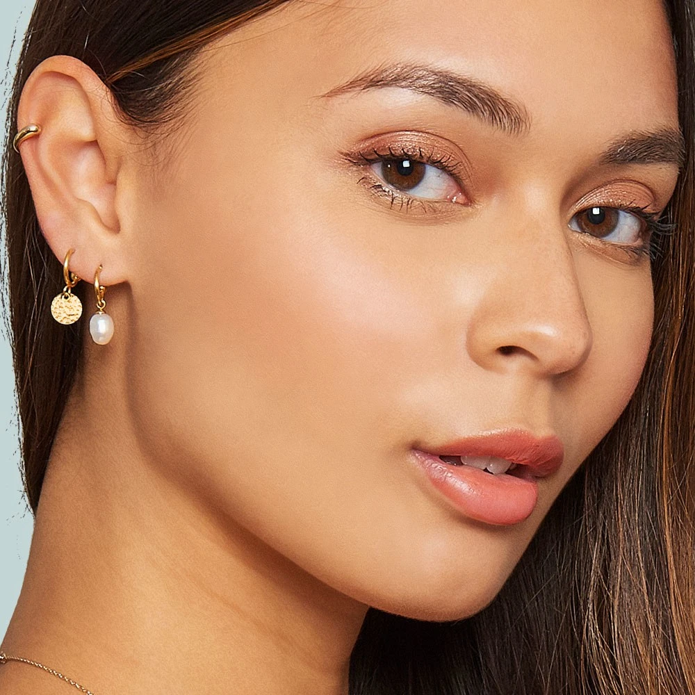 Set de trois boucles d’oreilles en acier inoxydable trempé dans un bain doré, agrémentées de perle de culture et pastille martelée, signées Siloé.